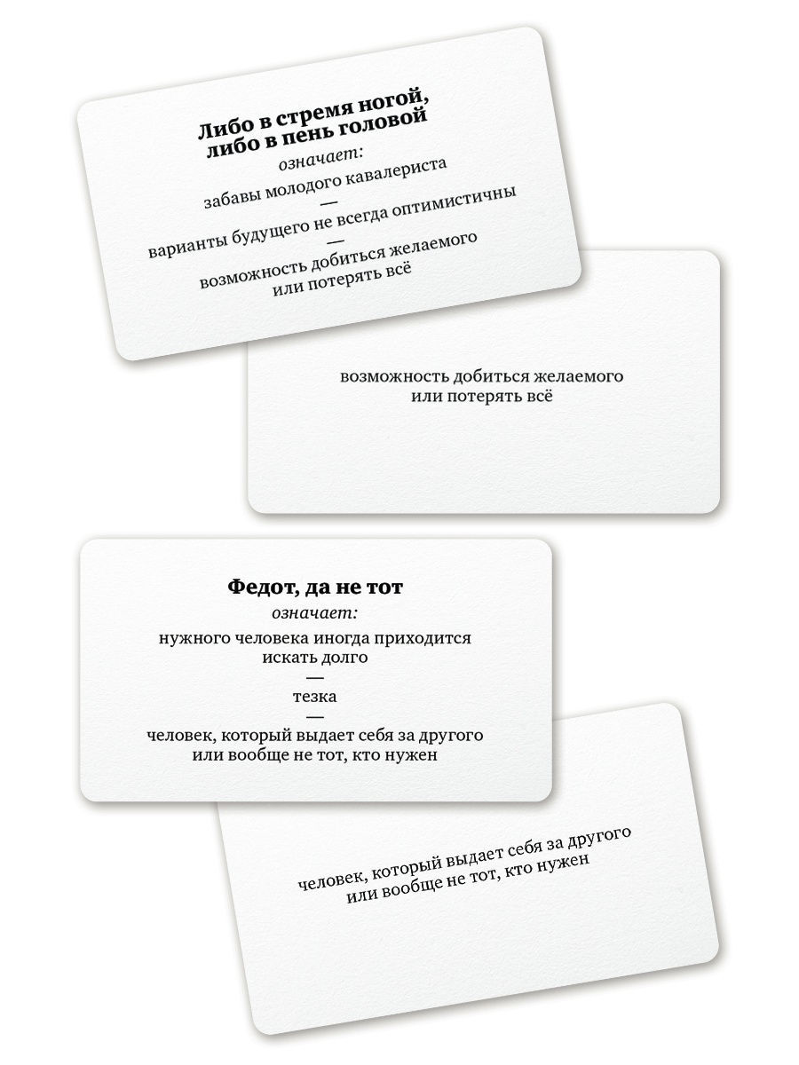 В небольшой компактной коробочке вы найдете 120 карт с началом пословицы, и тремя вариантами ее окончания. На обратной стороне карты будет написан правильный вариант ответа. Один из игроков вытаскивает карту, зачитывает ее, а остальные участники соревнуются между собой, кто правильно отгадает.