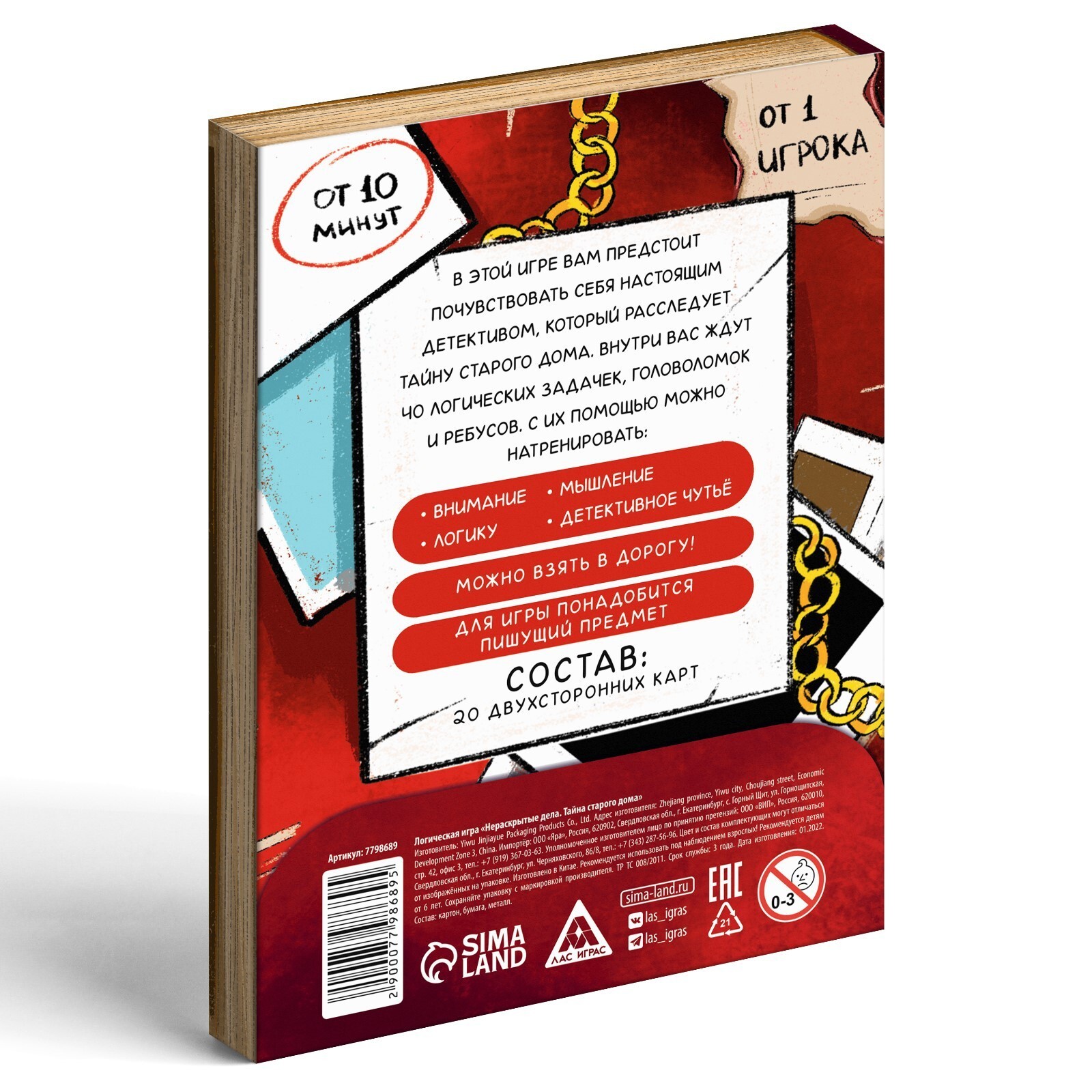 Чтобы узнать тайну старого дома, вам предстоит решить множество интересных заданий и головоломок. На двусторонних картах вы найдете шифры, ребусы, задачи на внимательность, а также составление слов из определенных букв. Попробуйте разгадать тайну старого дома в одиночку, или соберитесь компанией и постарайтесь найти решение для всех задач!