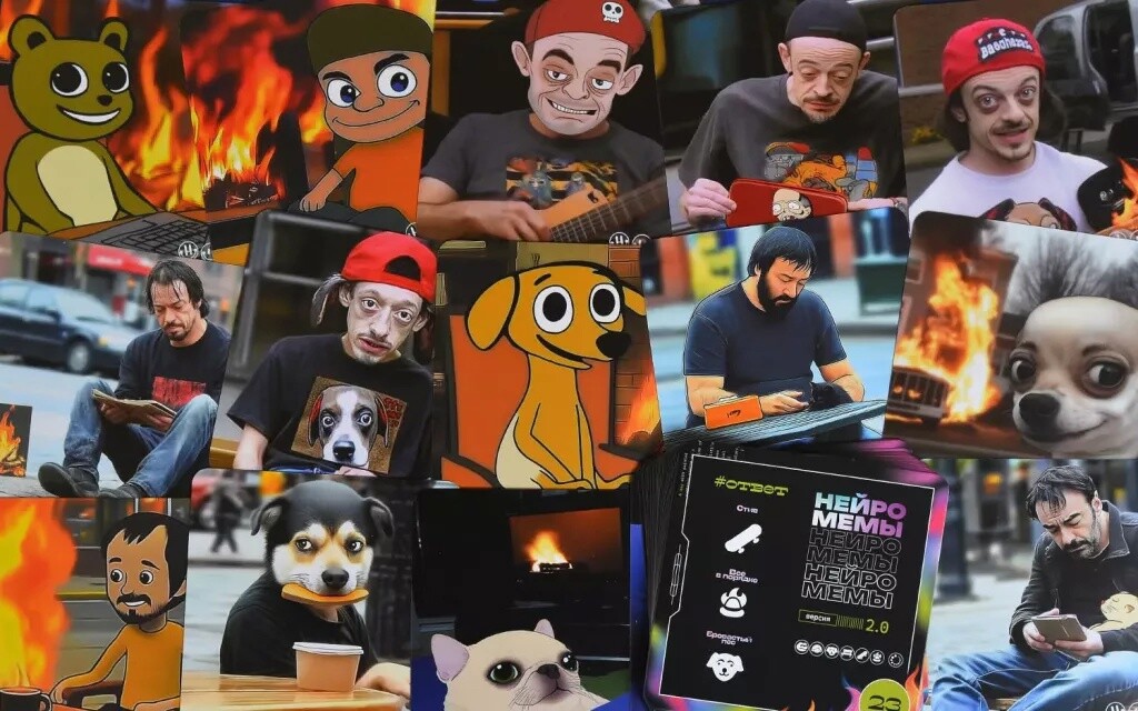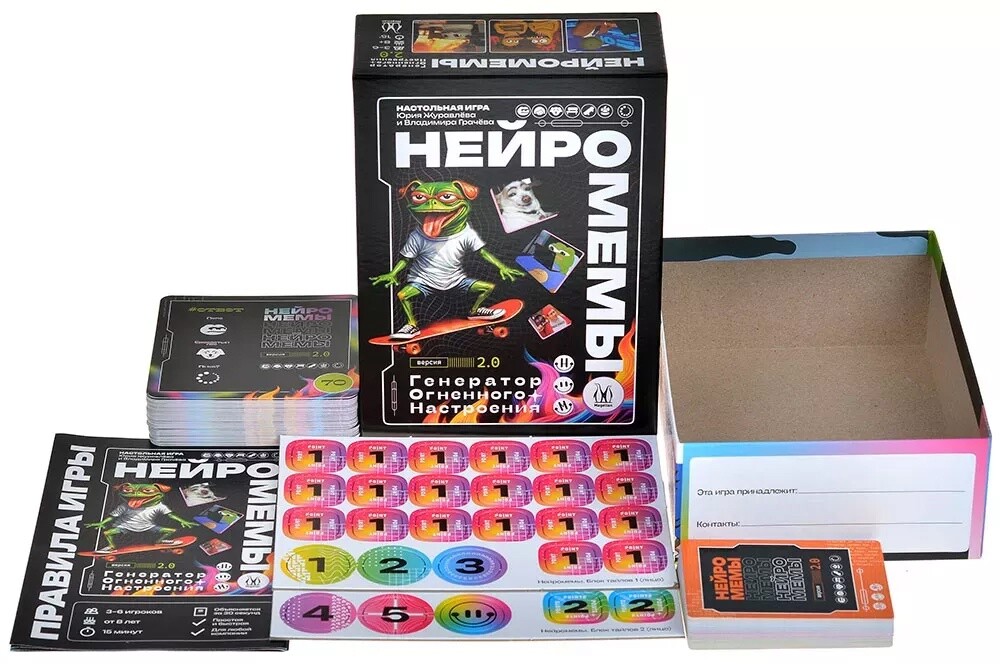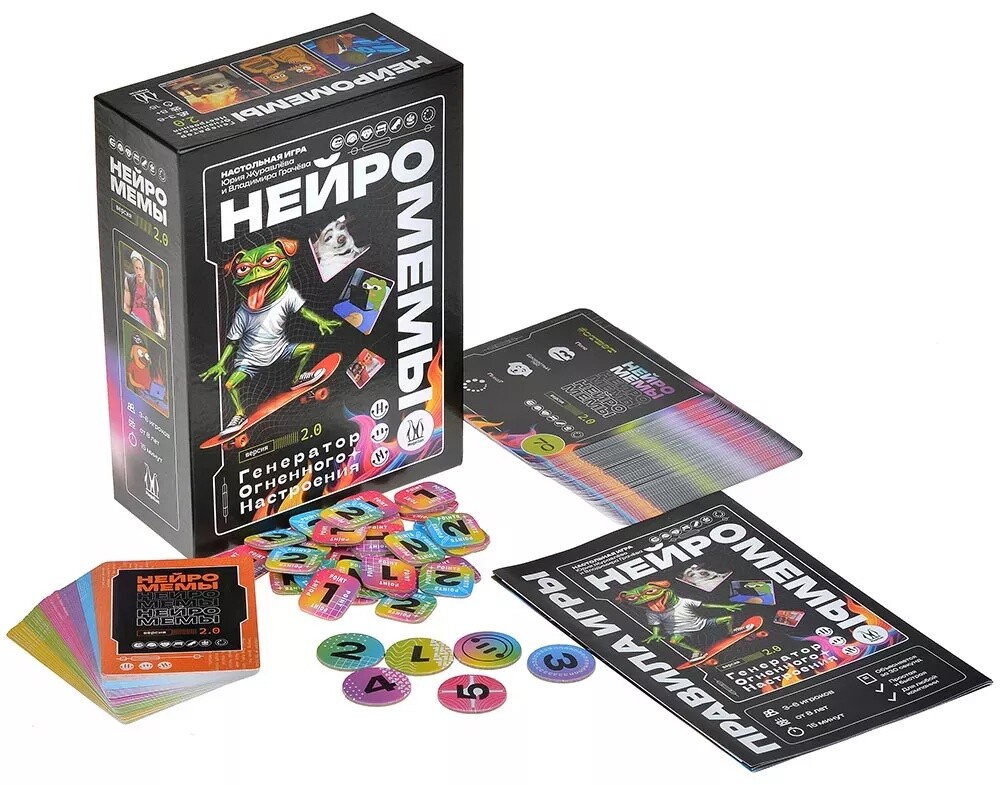 42 стартовых мема (6 наборов по 7 карт)70 карт нейромемов5 пронумерованных жетонов40 монетПравила игры