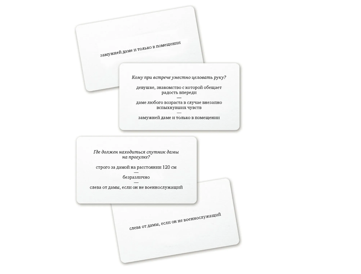 Готовы проверить свои знания этикета? В коробке вы найдете сто двадцать карточек, на лицевой стороне которых будут указаны разные жизненные ситуации, требующие решения. С обратной стороны каждой карты вы найдете три варианта решения вопроса, причем именно с точки зрения этики и воспитания. Зачитав ситуацию и варианты, каждый из игроков выбирает только один ответ. Окажется ли он правильным? Если да, тогда этот участник получит победные очки. Кто сможет набрать наибольшее количество правильных ответов, тот и победит!