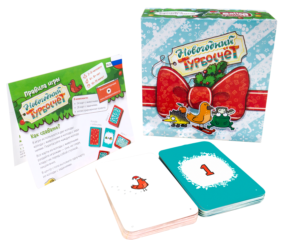 Собирайтесь за одним столом, пришло время развить навыки быстрого счета. Каждый игрок получит на руки карты в закрытую с разным количеством животных в новогодней стилистике, а в центре стола окажется колода с картами заданий. Задания направлены на арифметические операции и открываются по одной. Как только участники увидят задание, им нужно перевернуть карту из своей стопки рубашкой вниз. Игрокам следует быть крайне внимательными, и быстро найти ответ на задачу, ведь он может оказаться на одной из перевернутых карт. Увидели? Тогда быстро хлопните по ней рукой! Если игрок успеет это сделать раньше остальных, он получит эту карту себе. Но если он ошибся, тогда придется отдать свою карту из личной стопки.
