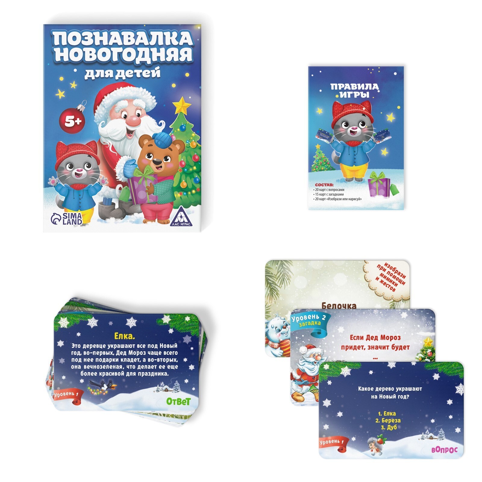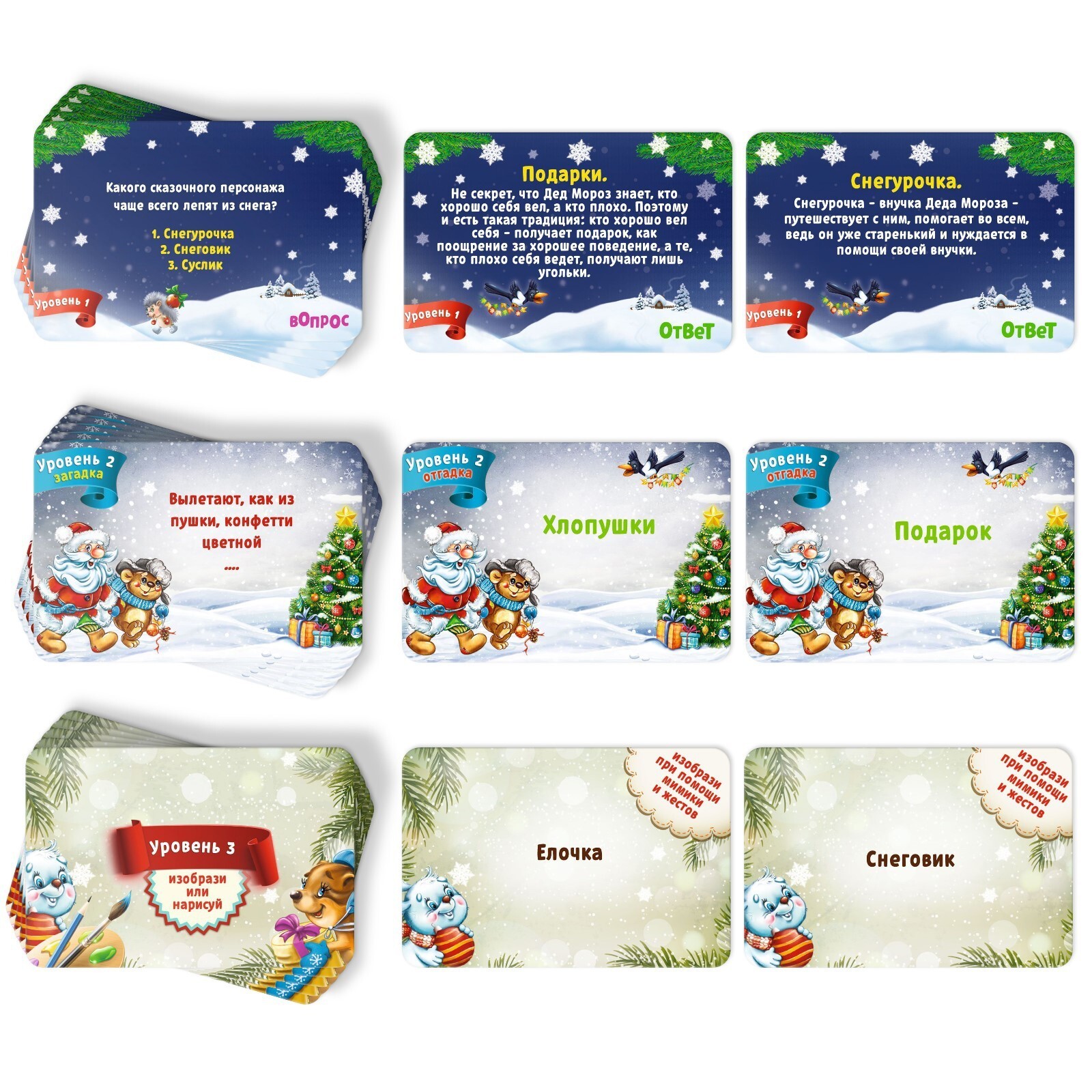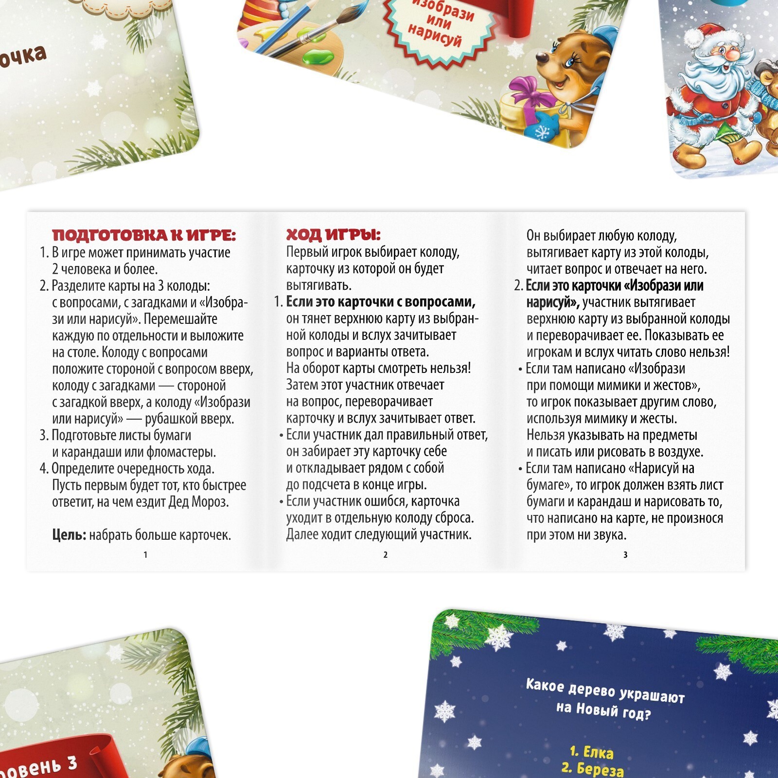 В данной детской игре вас ждут три варианта веселых заданий, каждое из которых оформлено в новогодней тематике. Попробуйте найти ответ на загадки о зимнем времени, соревнуйтесь в новогодней викторине, или покажите с помощью пантомимы искомое слово. Кто сможет набрать наибольшее количество правильных ответов, тот и станет победителем!