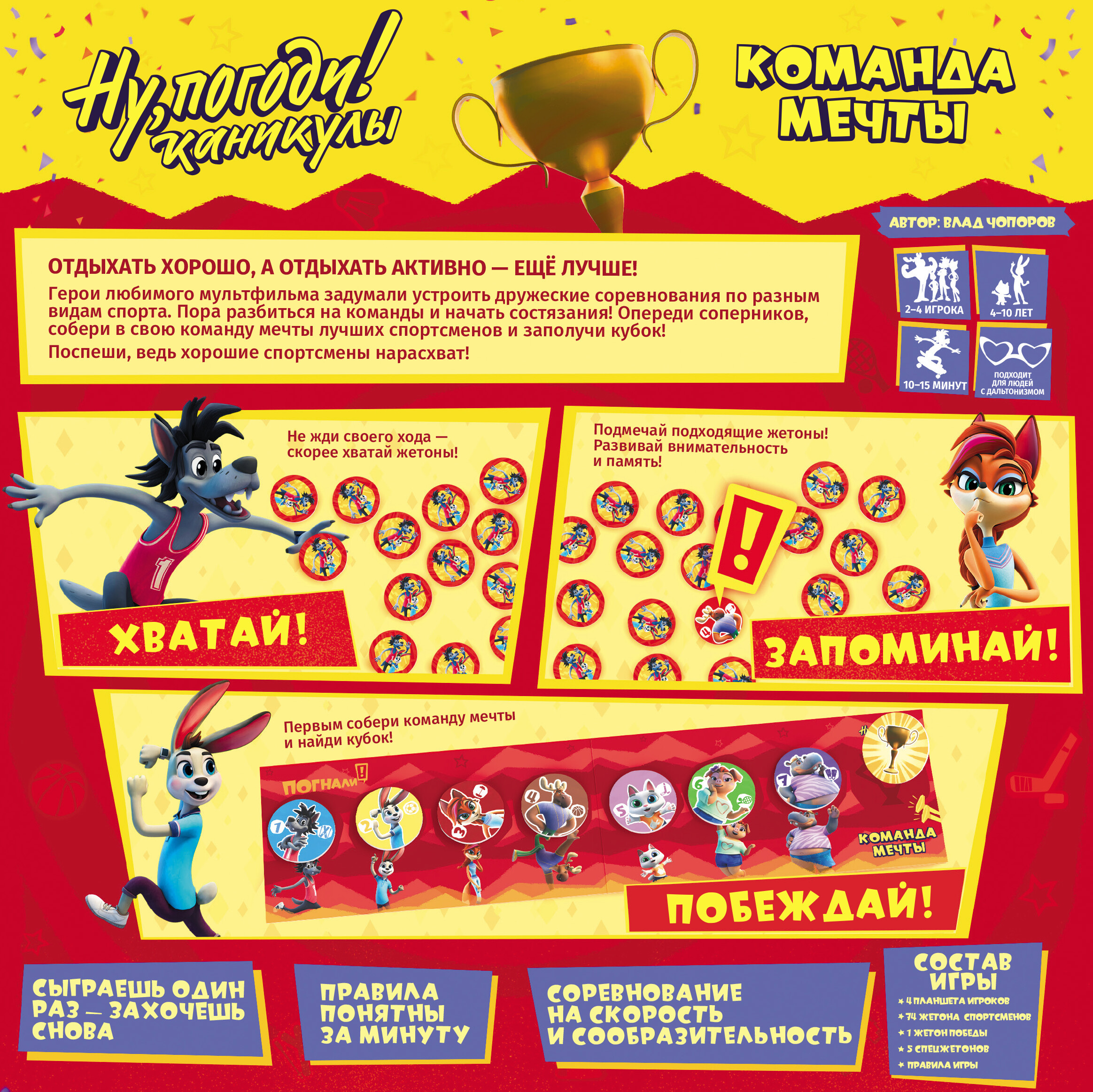 Кто станет победителем? В данной игре каждый участник постарается обойти другого и собрать лучшую команду спортсменов, выкладывая их жетоны на свой планшет. Жетоны нужно собирать из коробки, делая это одной рукой. В игре вы можете найти и специальные жетоны, благодаря которым нужно будет менять руку, или выкладывать спортсменов в другую сторону. Как только будет собрана вся команда и найден жетон победы, сообщите об этом остальным и проверьте, не ошиблись ли вы. Если все правильно, остается только вас поздравить, ведь вы стали победителем!