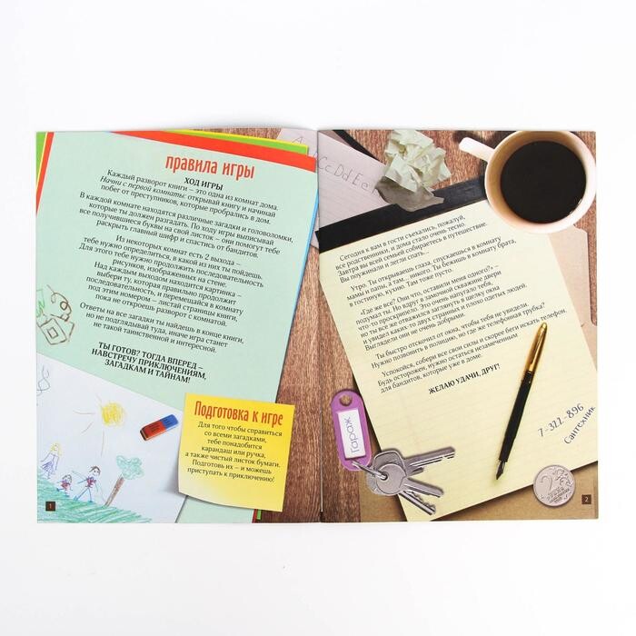 Данная книга является увлекательным приключением, которое можно проходить как в одиночку, так и компанией. Каждый разворот представляет собой изображение комнаты, в которой вам нужно будет искать подсказки и решать головоломки. Решайте, куда двинуться дальше и берегитесь грабителей, ведь они уже рядом! Если что-то вызовет у вас трудности, вы всегда можете найти ответ на последней странице, но ведь самому найти решение гораздо интереснее, не так ли?