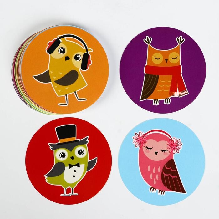 В игре вы найдете множество карточек разных цветов с иллюстрациями различных сов. Выложив все карты на стол, игроки кидают кубики, на одном из которых совушка, а на другом цвет. По соотношению выпавших граней участникам нужно как можно быстрее найти совпадающую карту и хлопнуть по ней. Кто успел сделать это первым, получит карту себе. Игрок, набравший наибольшее количество карт, станет победителем!