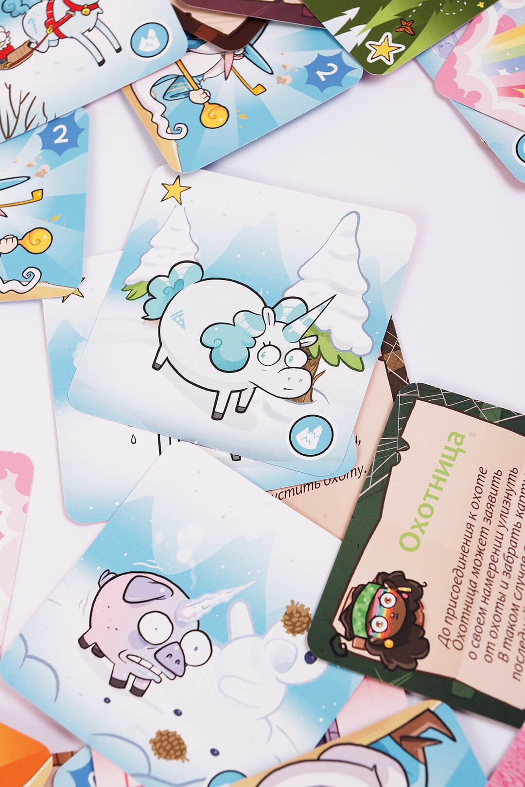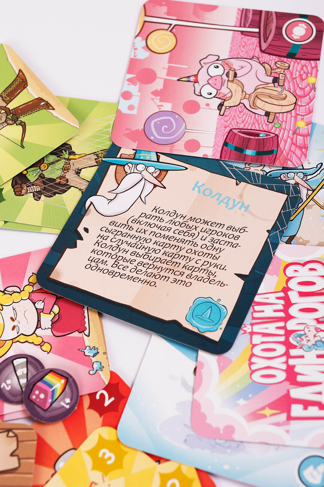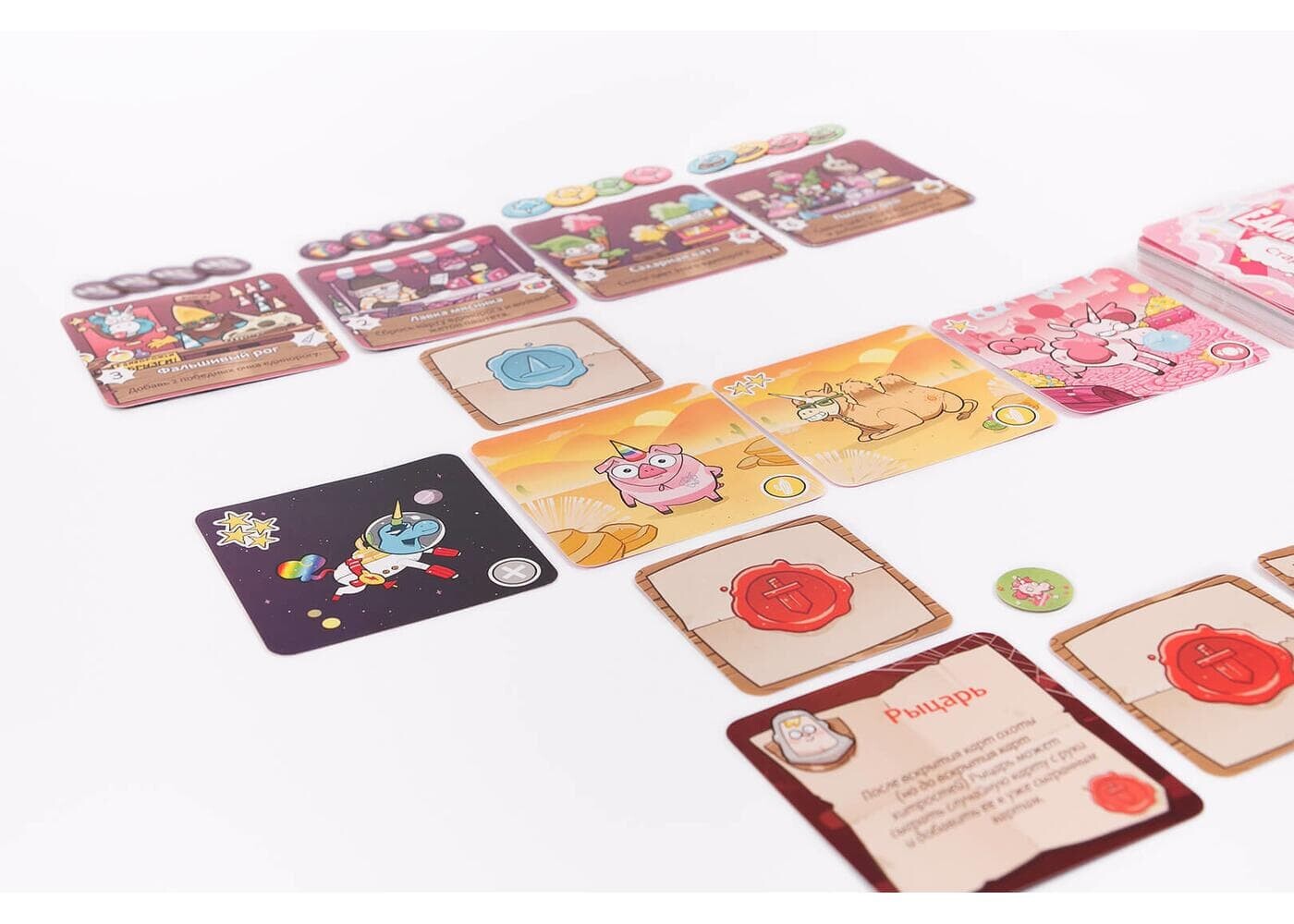 В данной карточной игре участникам предстоит отловить как можно больше единорогов. Причем, ценятся сказочные животные одинаковых цветов, поэтому игрокам придется постараться, чтобы собрать целую коллекцию и продать ее гномам на черном рынке. Помните, что соперники не дремлют, и постараются с помощью карт ловушек замедлить вас. Не попадитесь на штрафных свино-единорогов и станьте лучшим охотником!