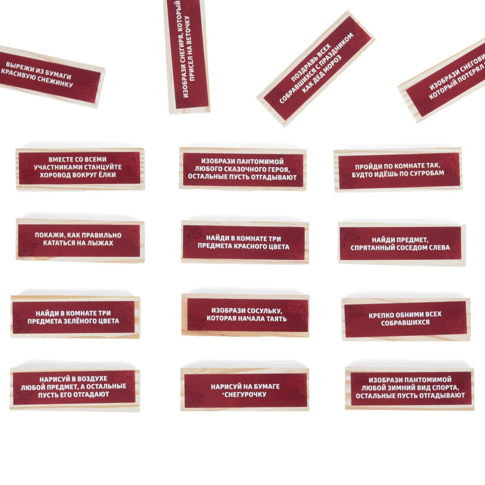 Данная игра проверит вашу аккуратность и подойдет для новогоднего праздника. Постройте башню из деревянных брусков, а затем осторожно вытаскивайте по одному элементу, стараясь не завалить всю конструкцию. На многих брусках вас ждут задания в новогодней тематике, которые нужно выполнить. Сможете не проиграть и оказаться в числе победителей?