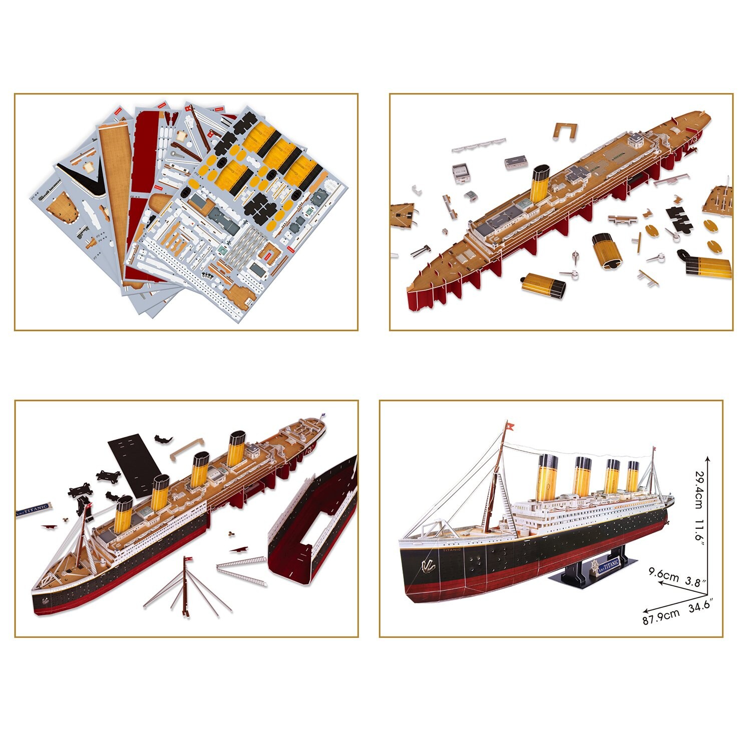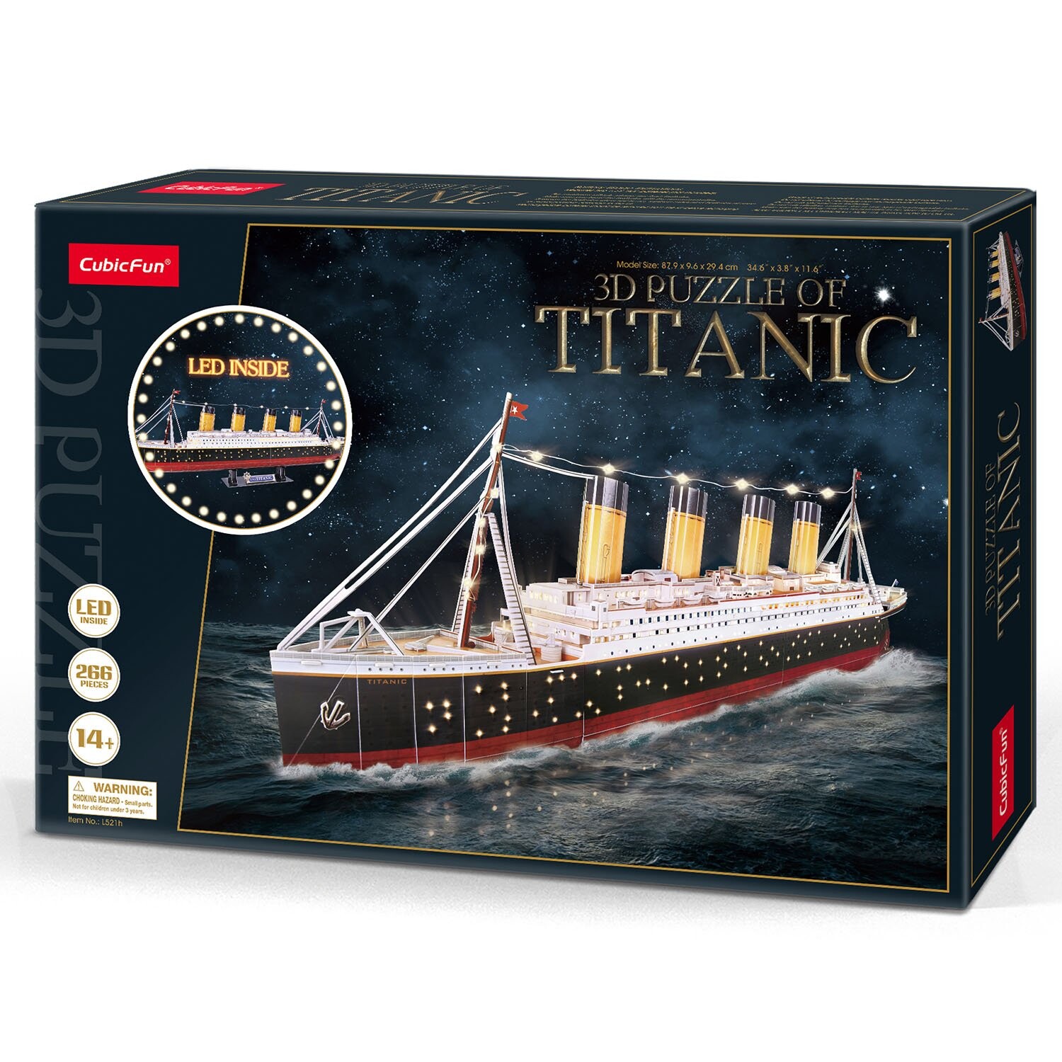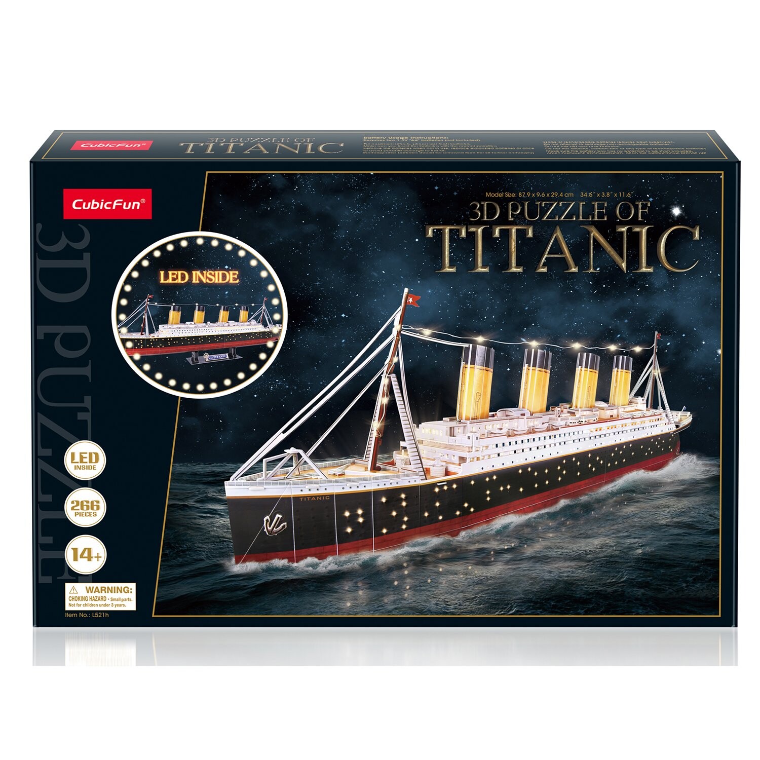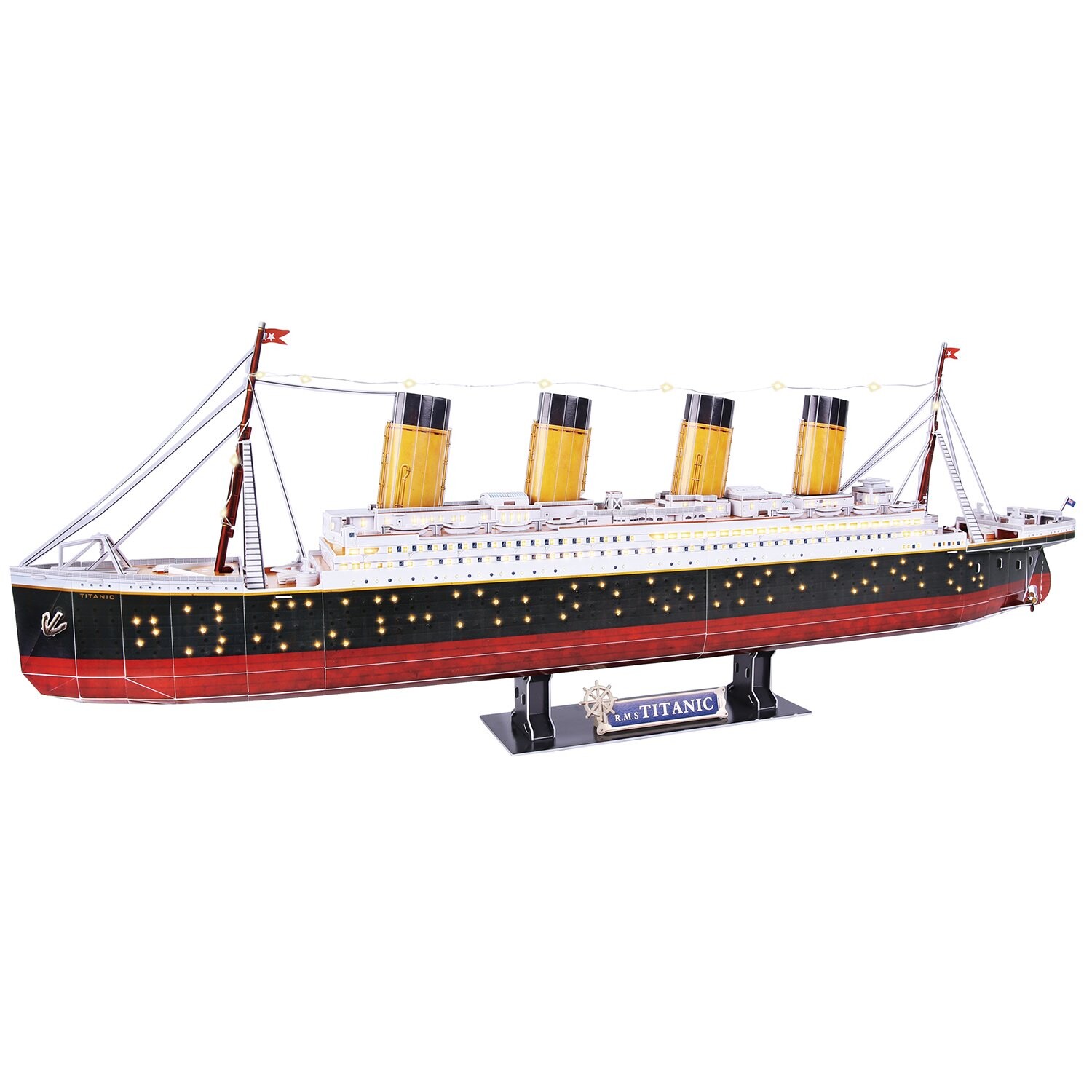 Пластиковые детали плотно крепятся друг к другу, образуя единую высокодетализированную конструкцию. Модель поставляется с удобной подставкой, а в центре судна находится подсветка для света корабельных иллюминаторов. В собранном виде корабль имеет размер 879х96х294мм.