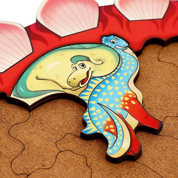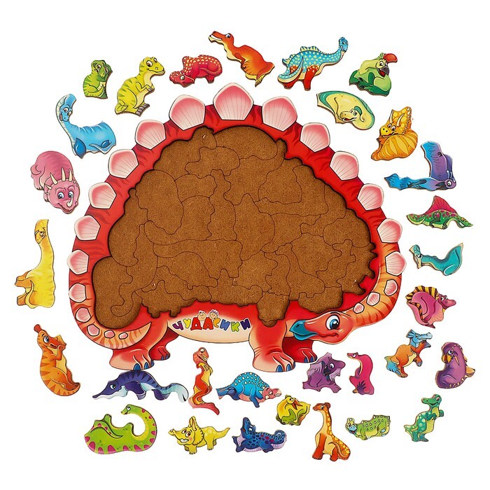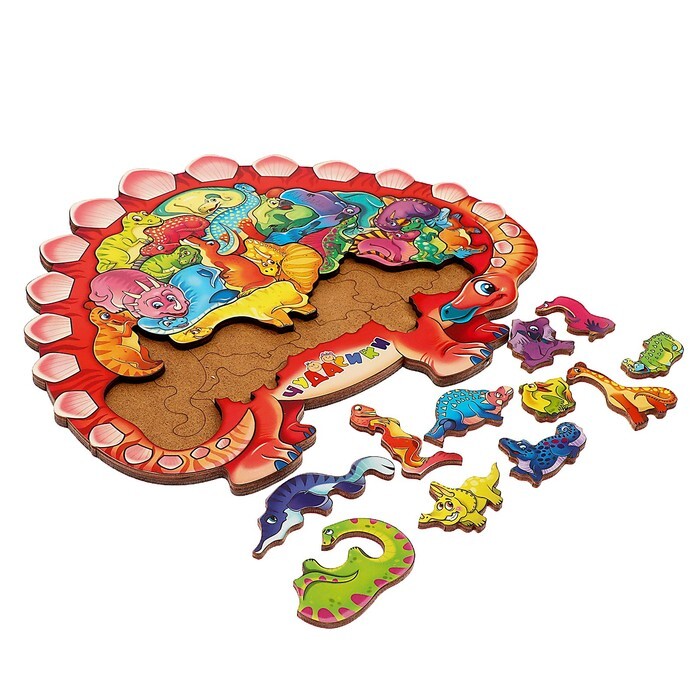 Детский развивающий пазл изготовлен из дерева. Яркие красочные динозавры разной формы и размера должны сложиться на специальном поле так, чтобы хватило места всем. Прикладывайте элементы друг к другу и постарайтесь сделать так, чтобы все динозаврики оказались вместе!