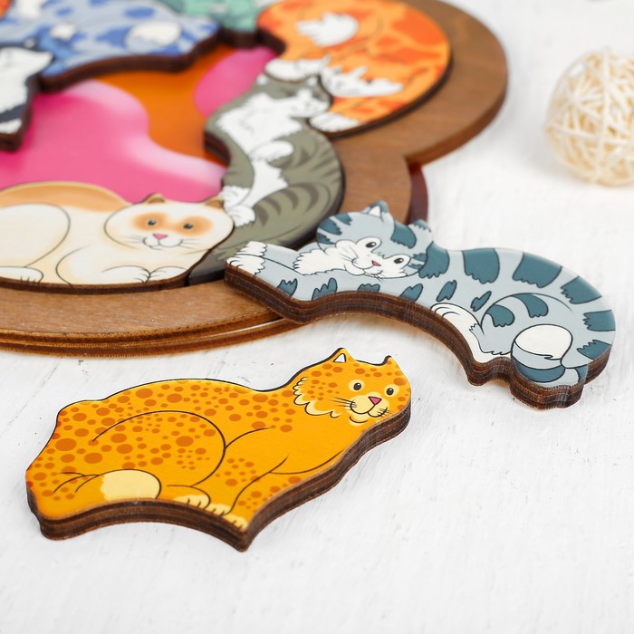 Десткий пазл-головоломка перед вами! С помощью деревянных фигурок кошек соберите целую картину и сделайте так, чтобы все элементы уместились в небольшом поле.