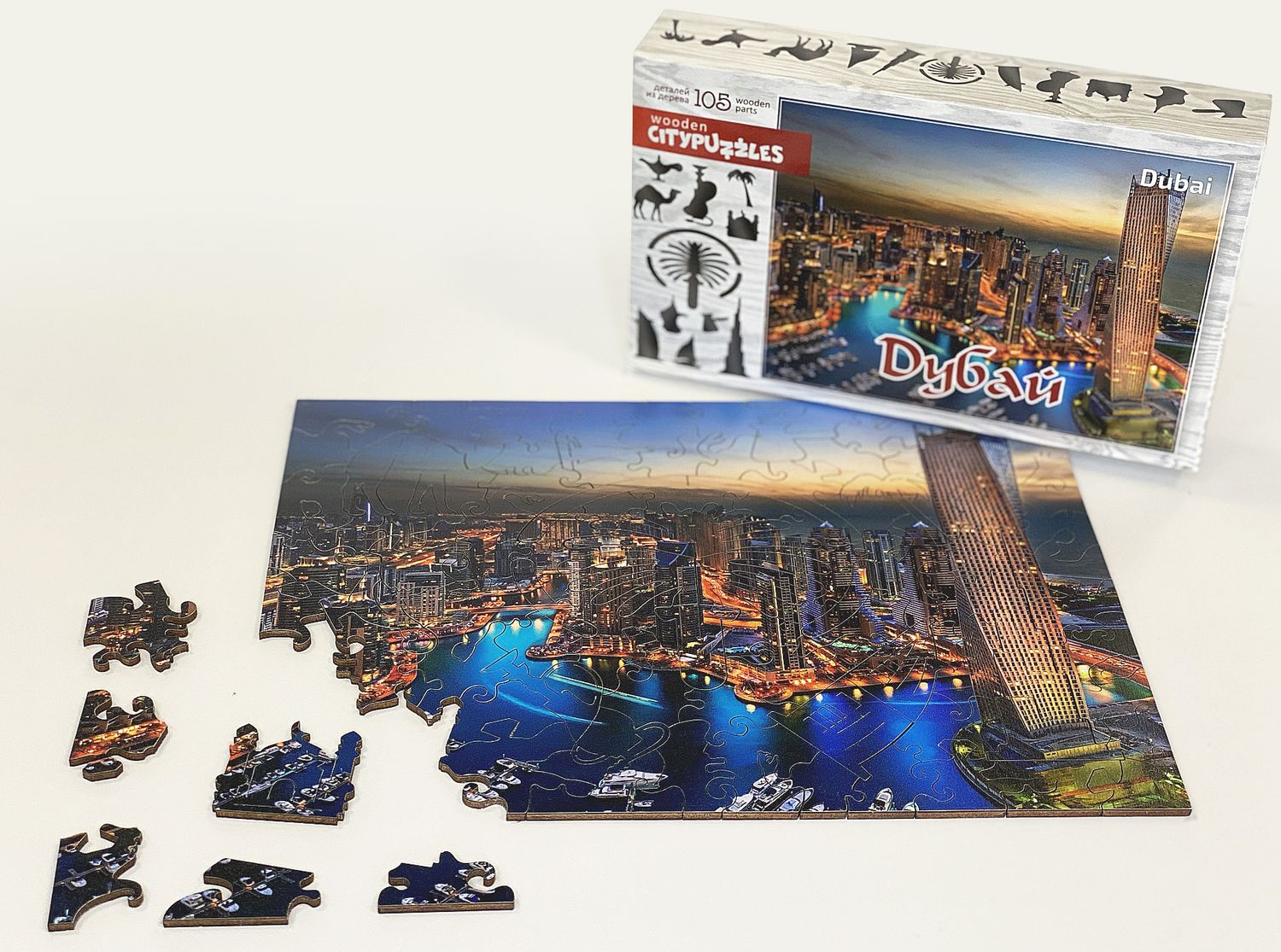 В коробке вы найдете сто пять прочных деревянных элементов разной формы. Устройте зарядку для ума и соберите красочную иллюстрацию с ночным Дубаем, полным огней и жизни.