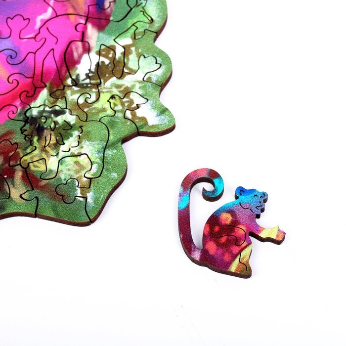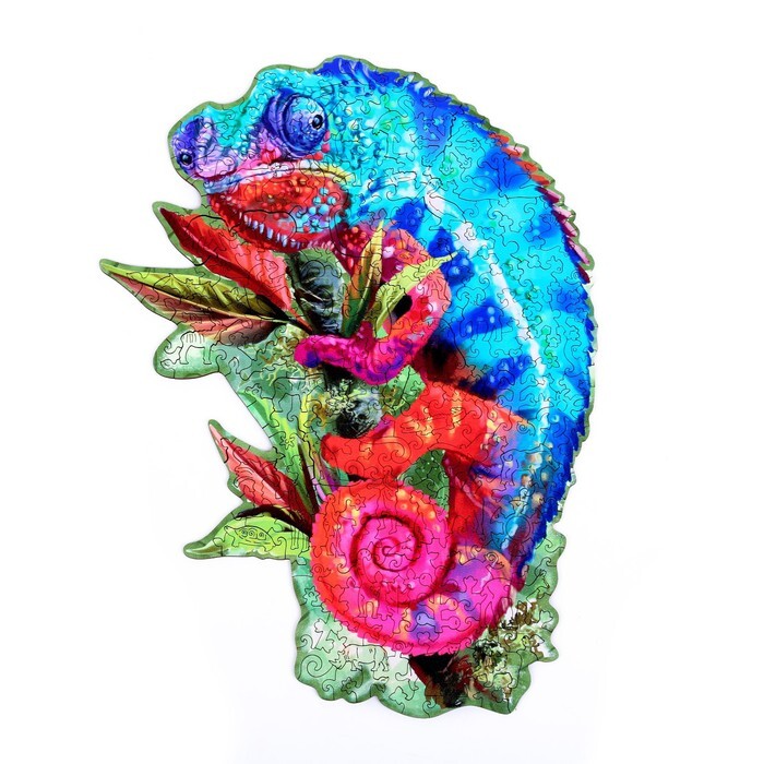Данный пазл изготовлен из дерева и имеет яркое качественное оформление. Деревянные элементы имею разную форму и размер, собираясь в красивую иллюстрацию с хамелеоном на ветке дерева. В коробке вы найдете 250 деталей.
