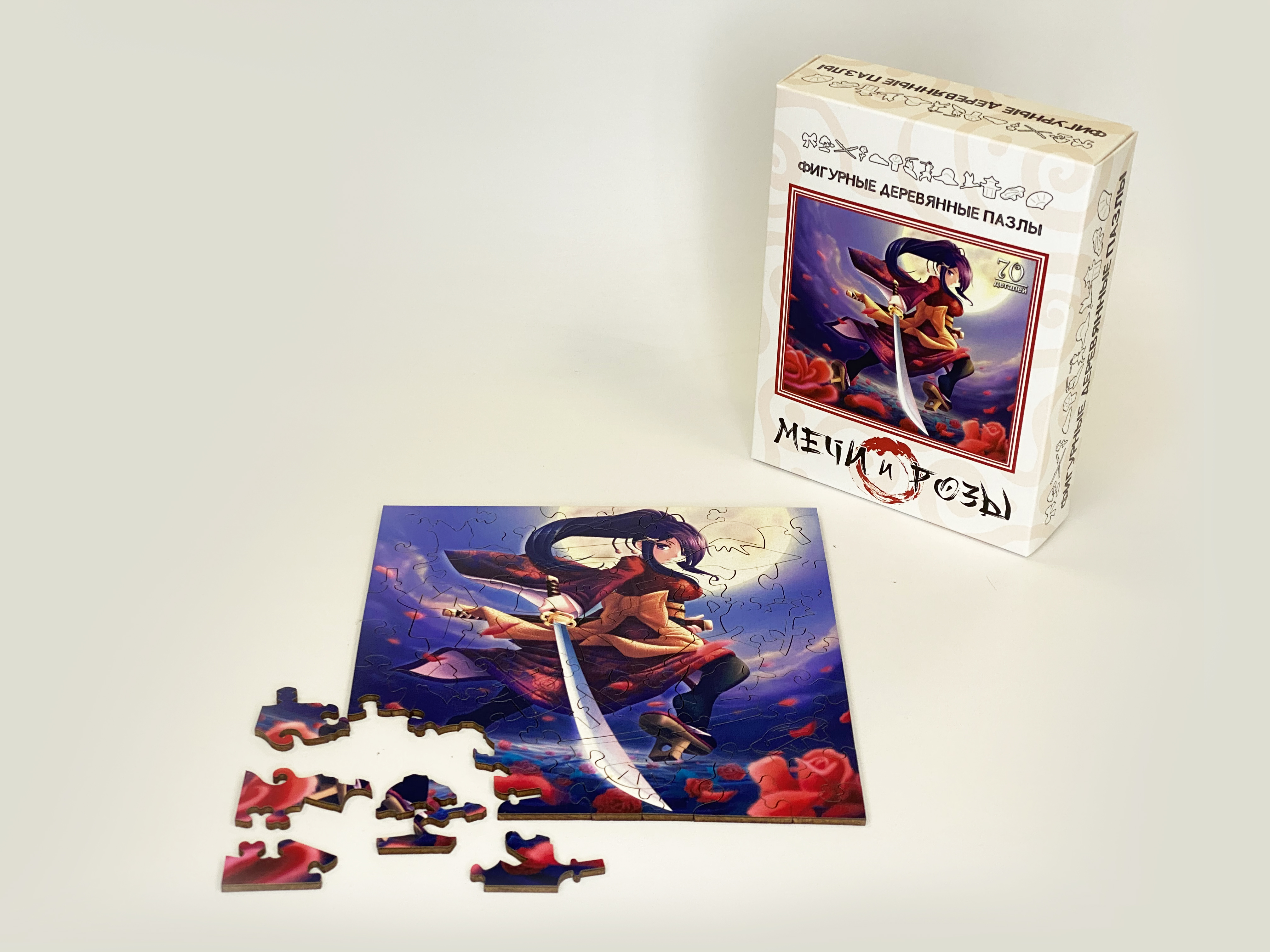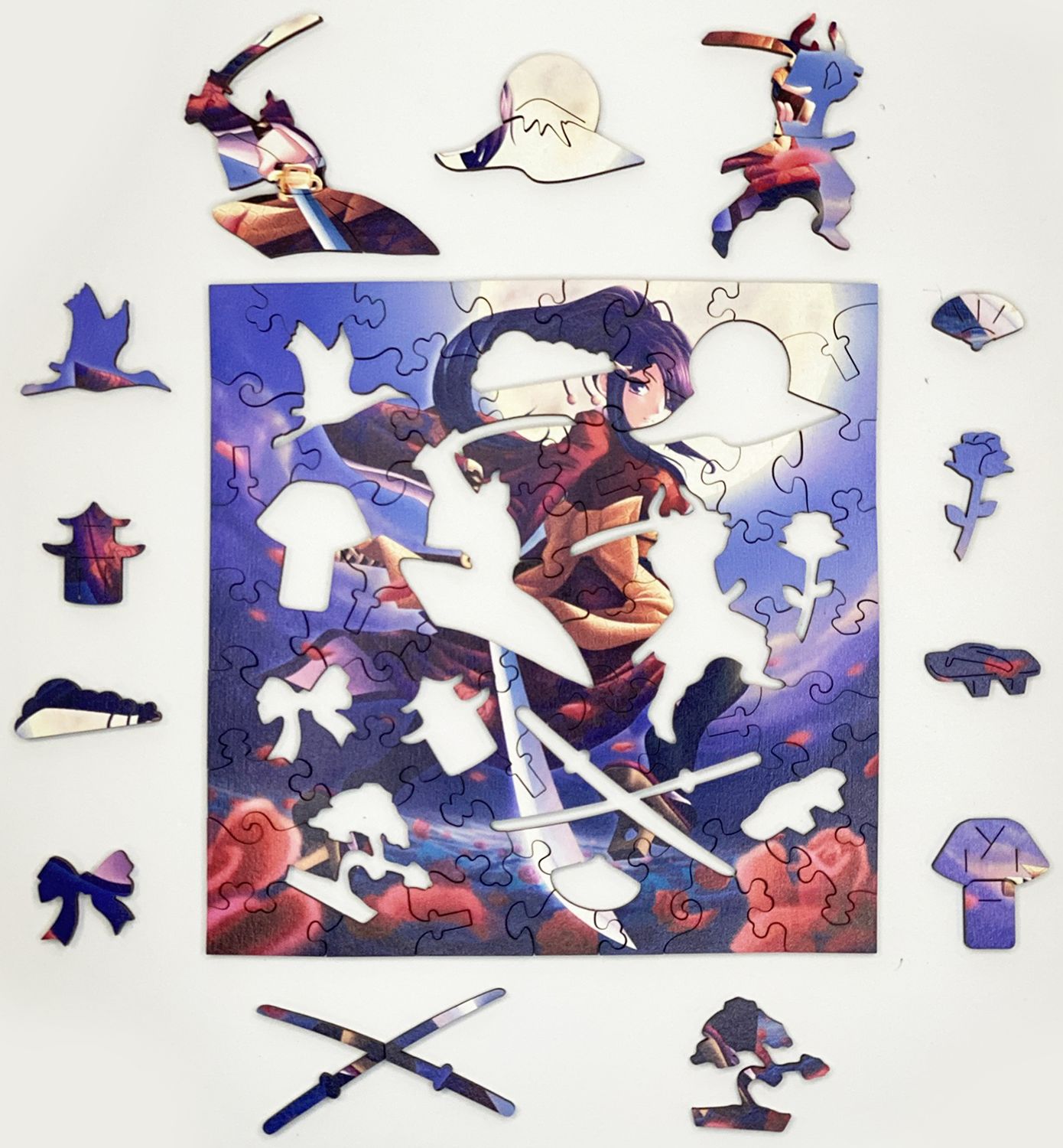 В коробке данного необычного пазла вы найдете пятьдесят деревянных деталей разных форм и размеров. С помощью них вы сможете собрать красивую иллюстрацию в аниме-стилистике.