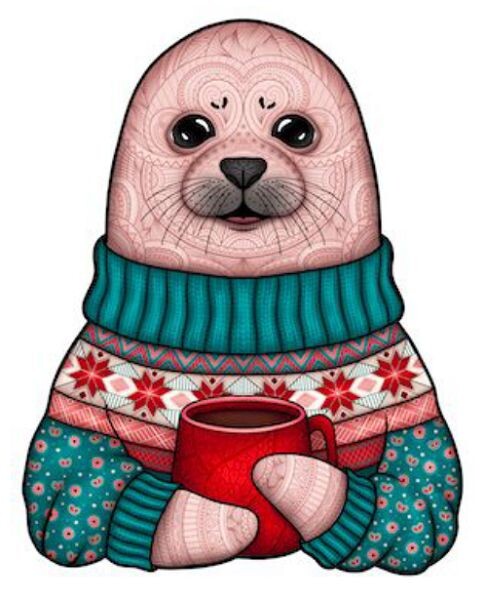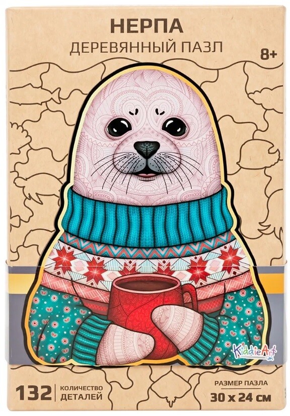 Соберите милую иллюстрацию нерпы в свитере! 132 деревянных детали разнообразной формы складываются в красочную картину размером 300x240мм.