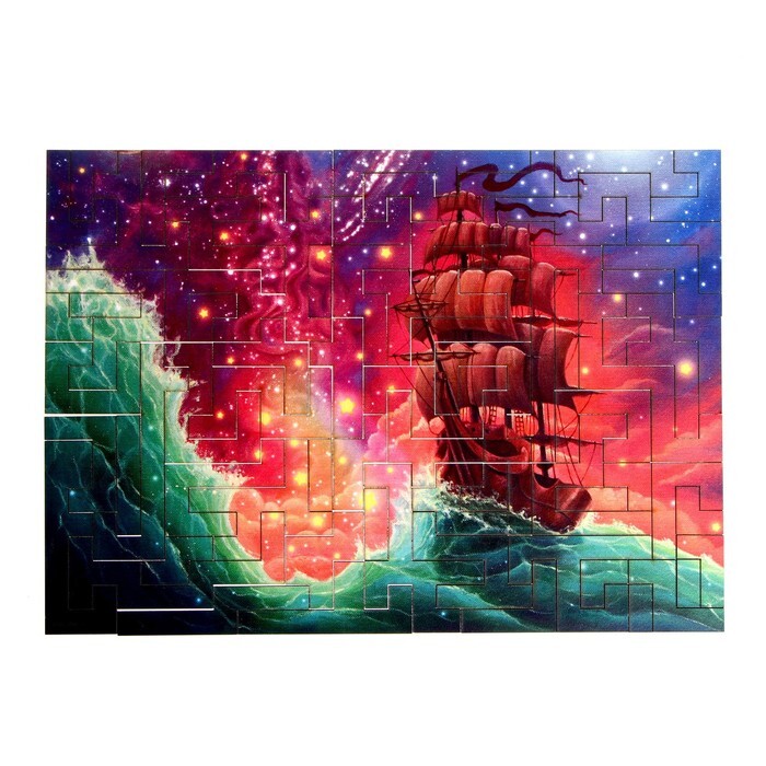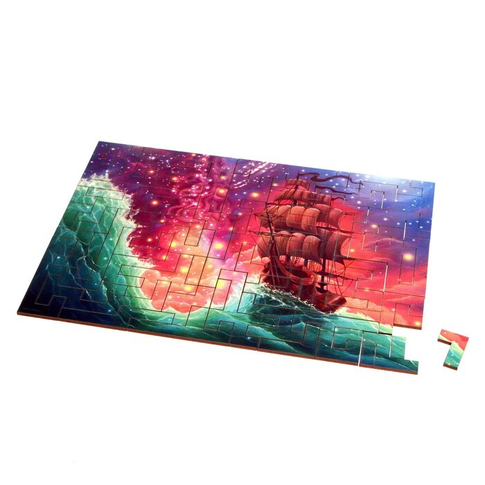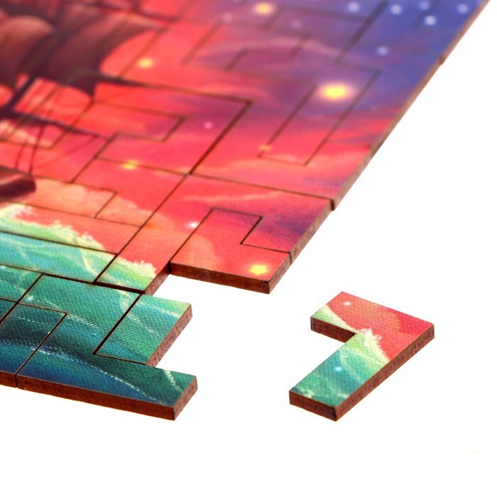 В отличие от множества своих коллег, данный пазл изготовлен из дерева и имеет высокое качество иллюстрации. Элементы разной формы и размера складываются в красочную и яркую сюрреалистическую картину космоса.