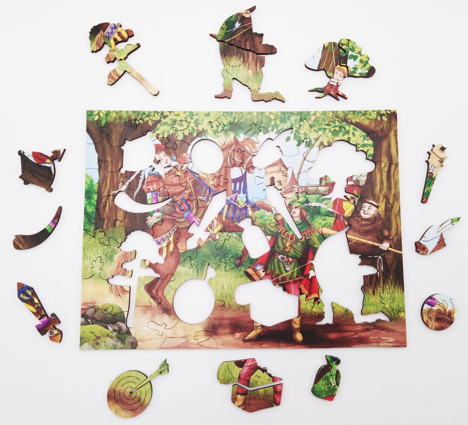 В коробке вы найдете множество деревянных элементов разной формы и размера. Соберите их в красочную иллюстрацию со знаменитым героем баллад и легенд!