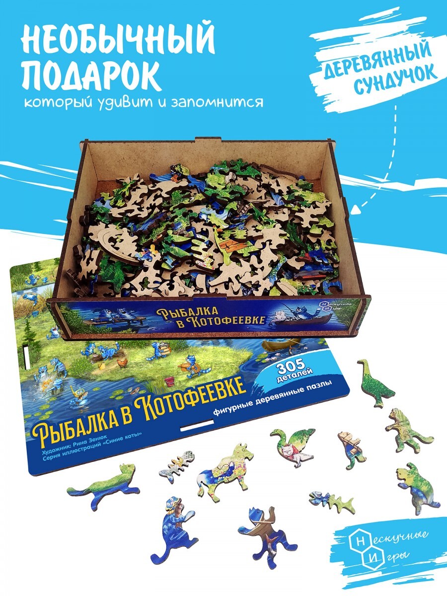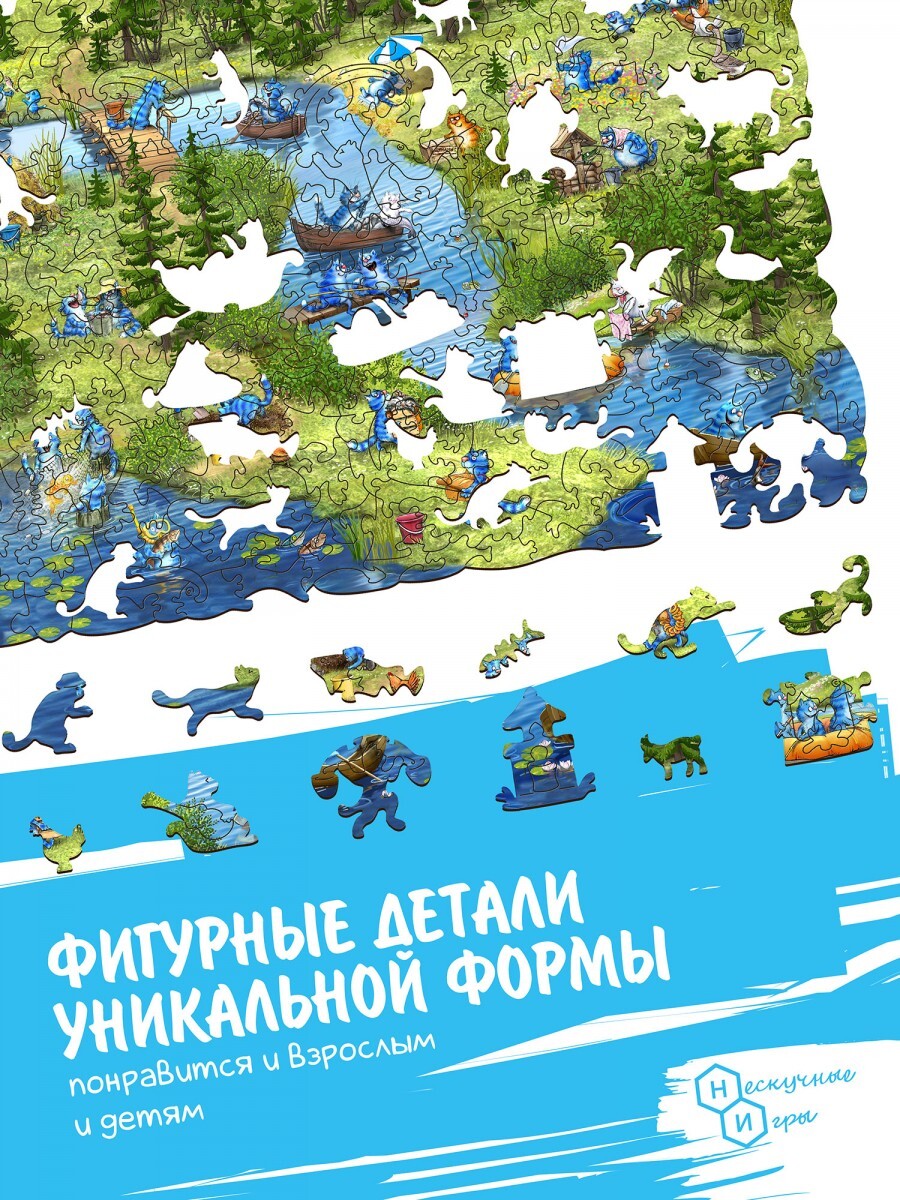 Деревянный фигурный пазл содержит чуть более трехсот прочных деталей с высоким качеством принта. Соберите все элементы вместе и получите большой коллаж с синими котами, отдыхающими и веселящимися на природе!