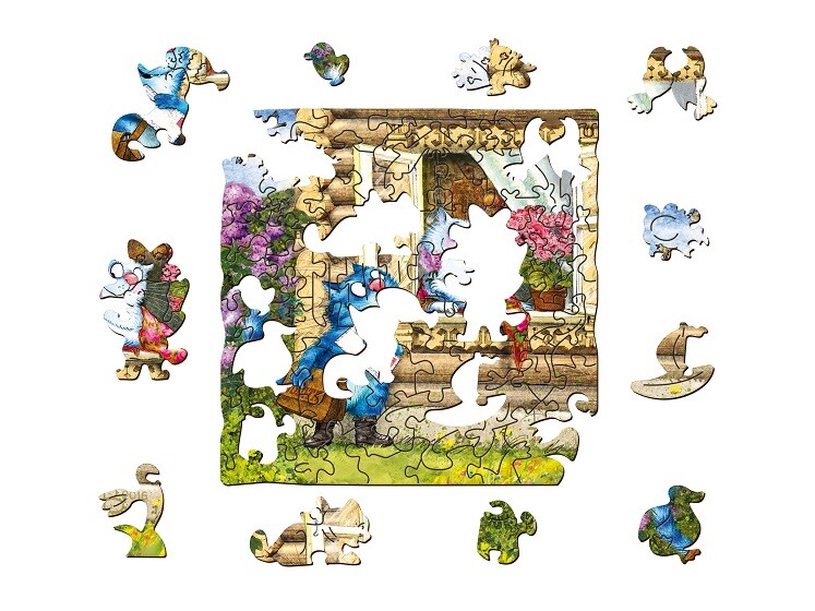 Данный фигурный пазл изготовлен из дерева и содержит прочные элементы разного размера и формы. Соберите все детали вместе, и у вас получится милая и яркая иллюстрация с веселыми синими котами в деревне!