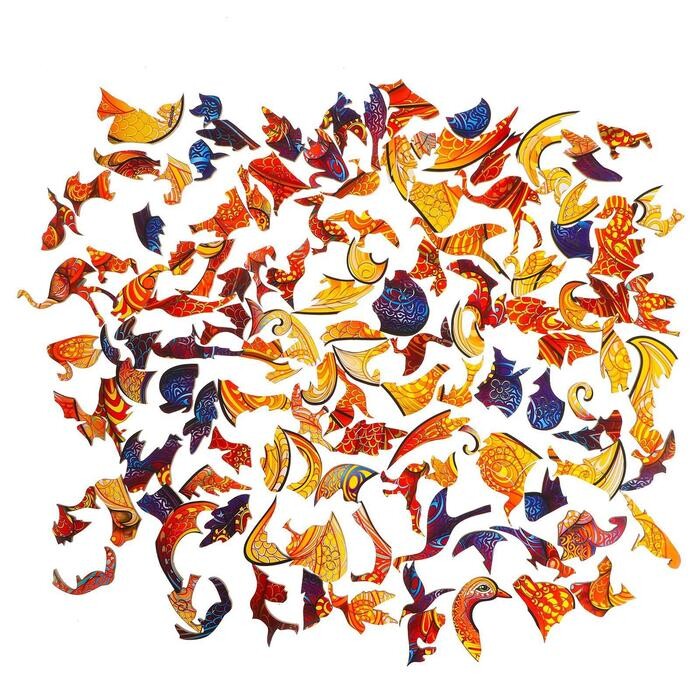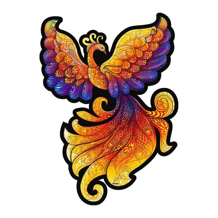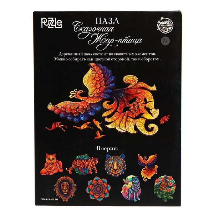 Красочный пазл содержит деревянные элементы, имеющие разную форму и размер. Обладающие высоким качеством материала изготовления и рисунка, детали складываются в яркое и красивое изображение сказочной птицы.