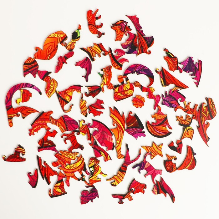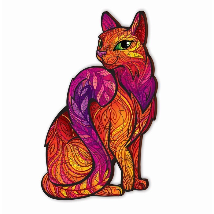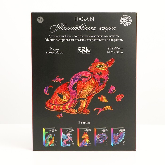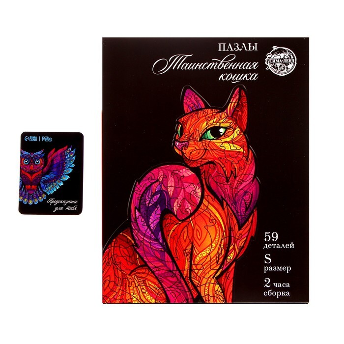 Фигурный пазл состоит из множества качественных деревянных деталей, каждая из которых представляет собой отдельную фигурки разной формы и размера. Детали собираются в яркую красивейшую иллюстрацию волшебной кошки. А еще вас ждет карточка с предсказанием!