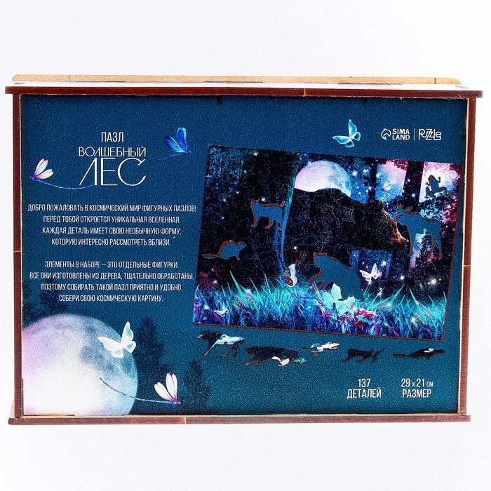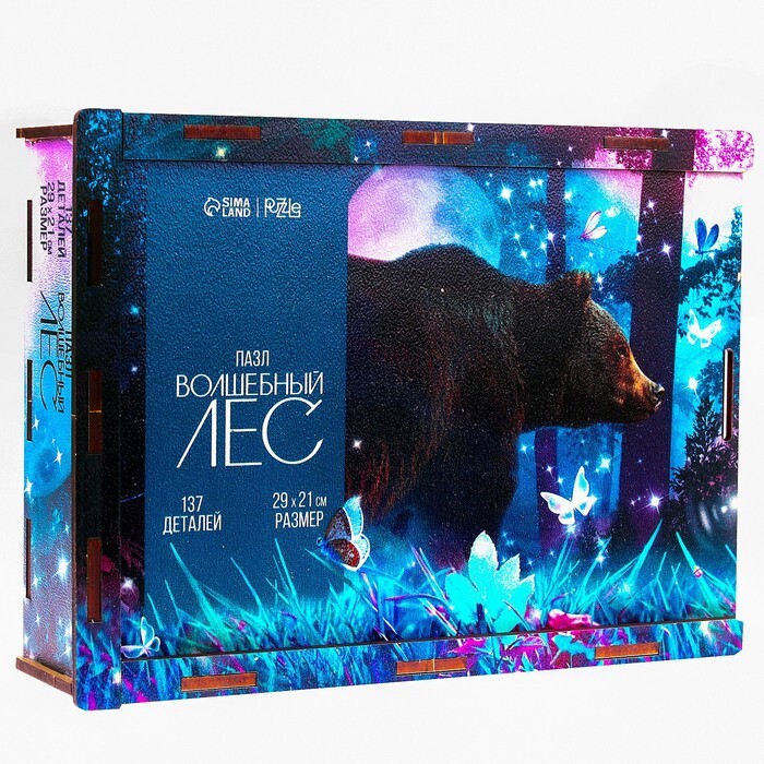 Получится ли у вас собрать цельную иллюстрацию? Данный пазл отличается от классических вариантов деревянными деталями. Элементы имеют разную форму и размер, а также высокое качество изготовления. Детали собираются в красочную иллюстрацию с медведем в сказочном ночном лесу.