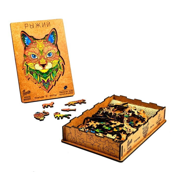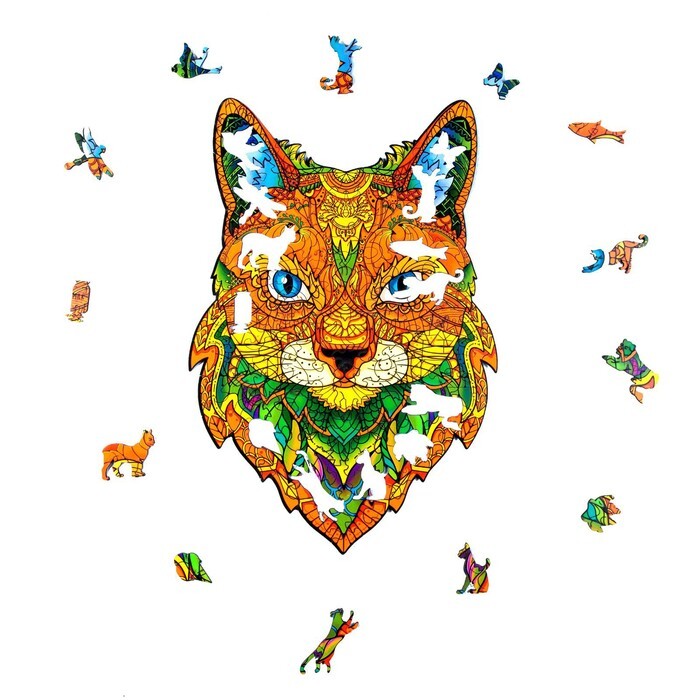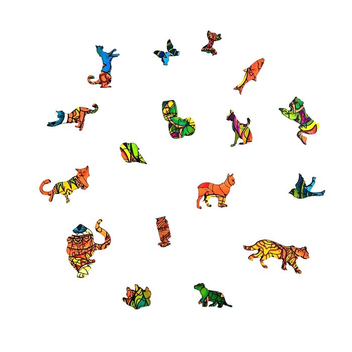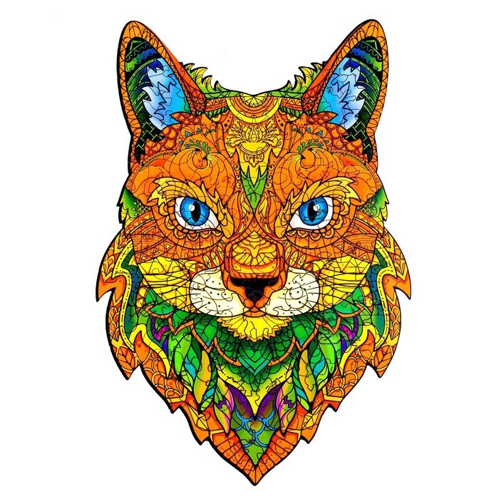 Данный пазл изготавливается из дерева. Элементы разной формы и размера имеют глянцевую поверхность и высокое качество иллюстрации. Собрав все детали воедино, вы получите красочное и разноцветное изображение кота.