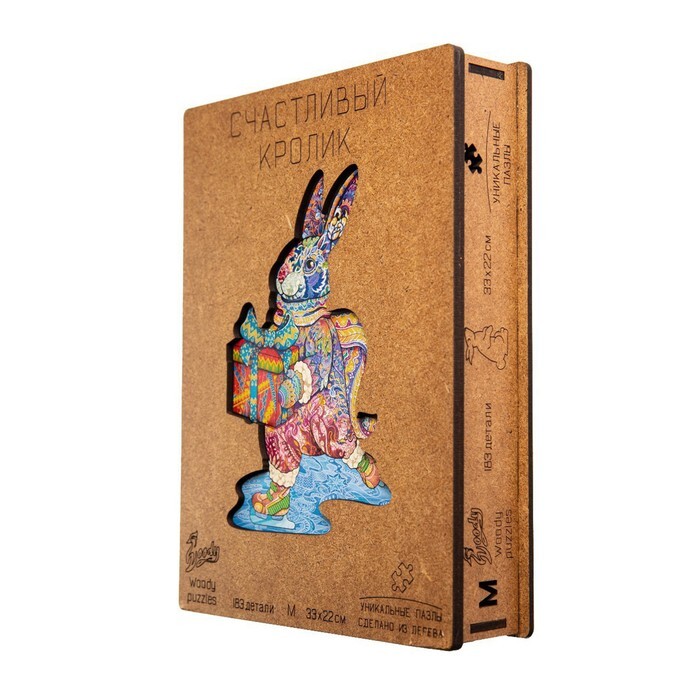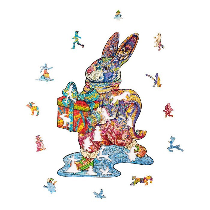 Красочный пазл изготавливается из дерева, а элементы имеют разную форму и размер. Собрав все детали воедино, вы получите яркую иллюстрацию новогоднего кролика с подарком в лапах! В коробке вы найдете 183 детали.