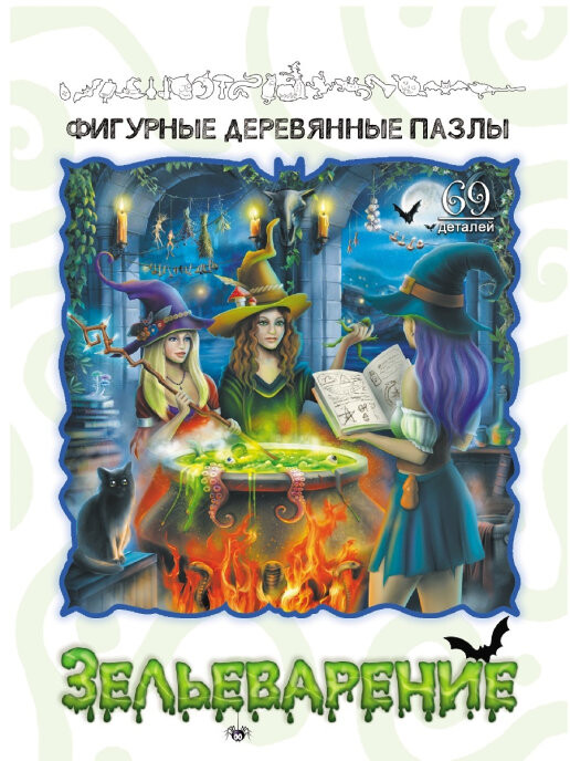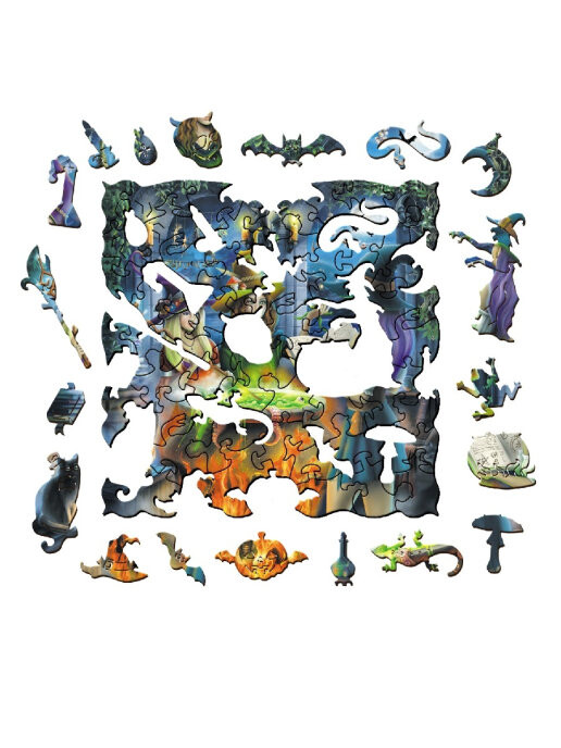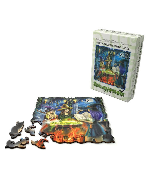 Устройте себе зарядку для ума! Возьмите качественные деревянные элементы и соберите красочную картину, полную атмосферы сказочности и изображающую чародеек вокруг котла с зельем.
