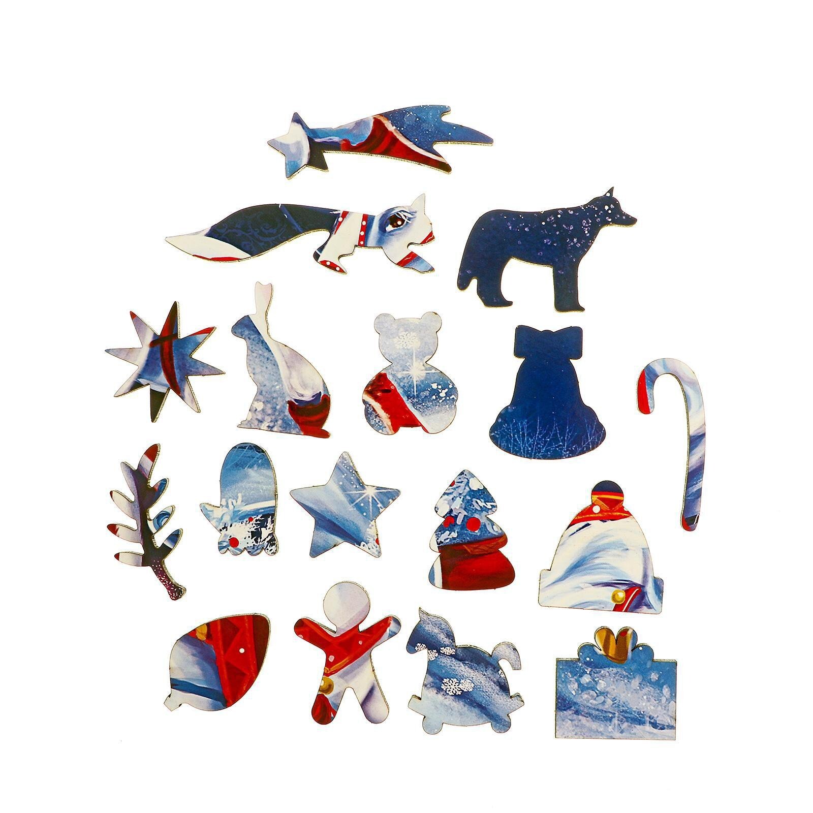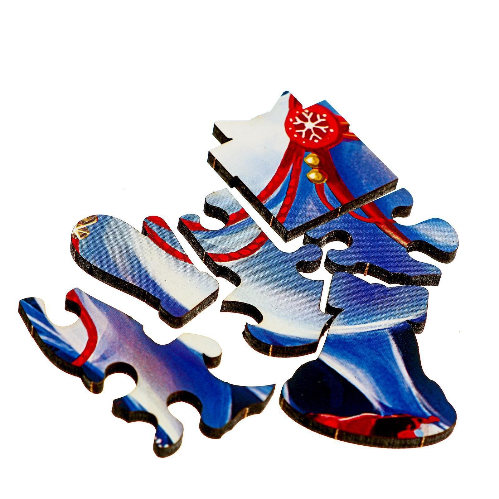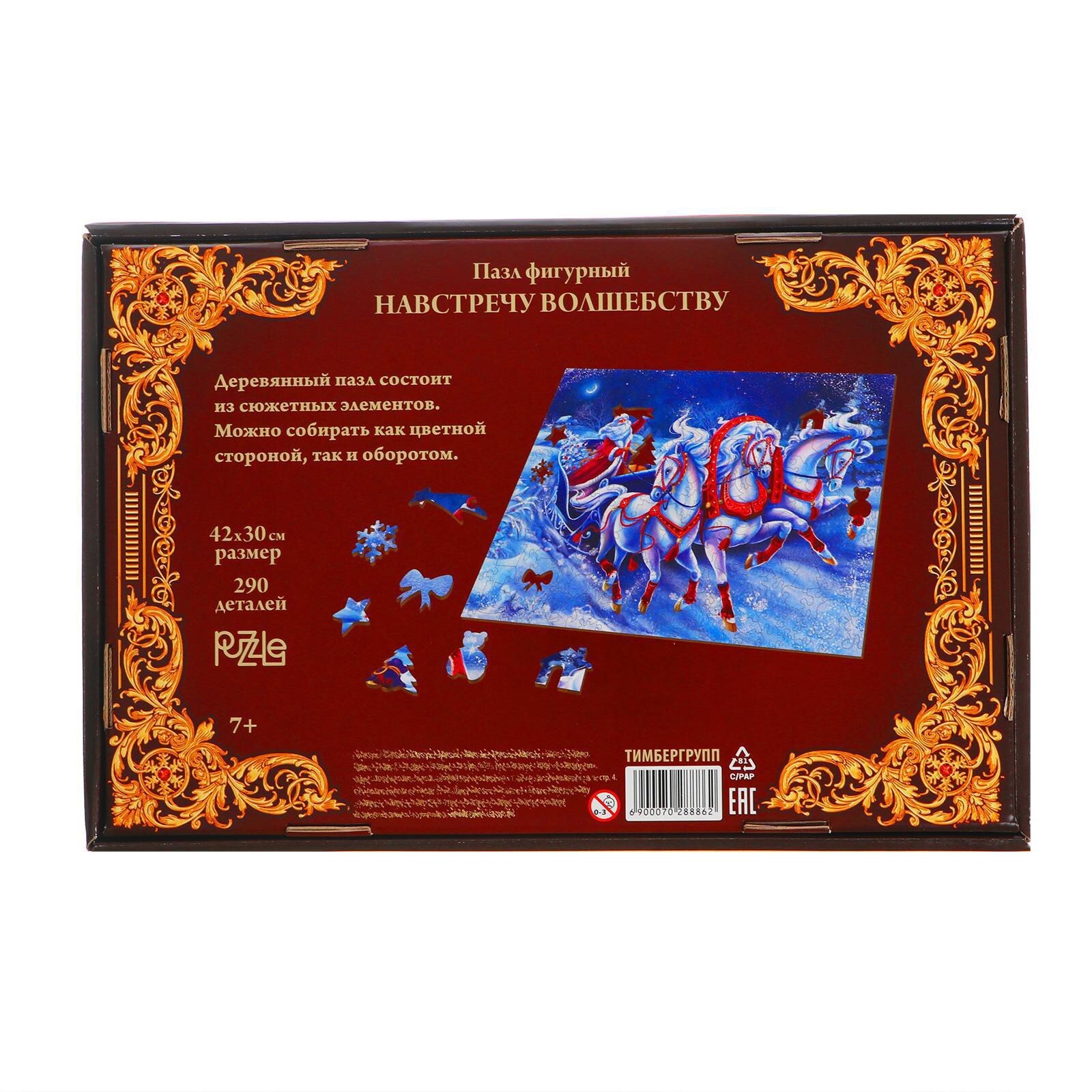 Большой красочный пазл изготовлен из дерева и складывается в сказочное новогоднее изображение Деда Мороза на санях, спешащего раздавать подарки. В коробке вы найдете двести девяносто деталей разной формы и размера.
