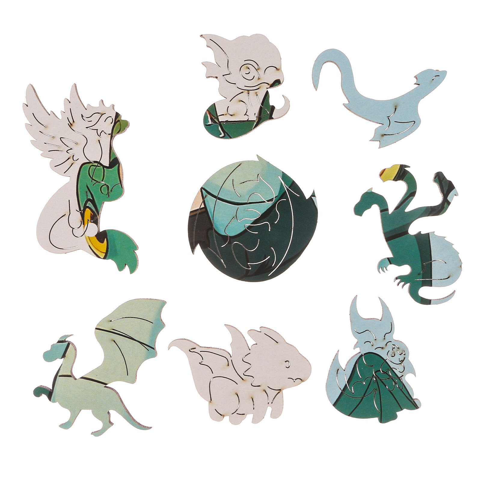 Данный пазл состоит из деревянных деталей, которые легко стыкуются друг к другу и обладают ярким принтом. В коробке вы найдете сто пятьдесят шесть элементов, которые собираются в красочную иллюстрацию нарисованного дракона.