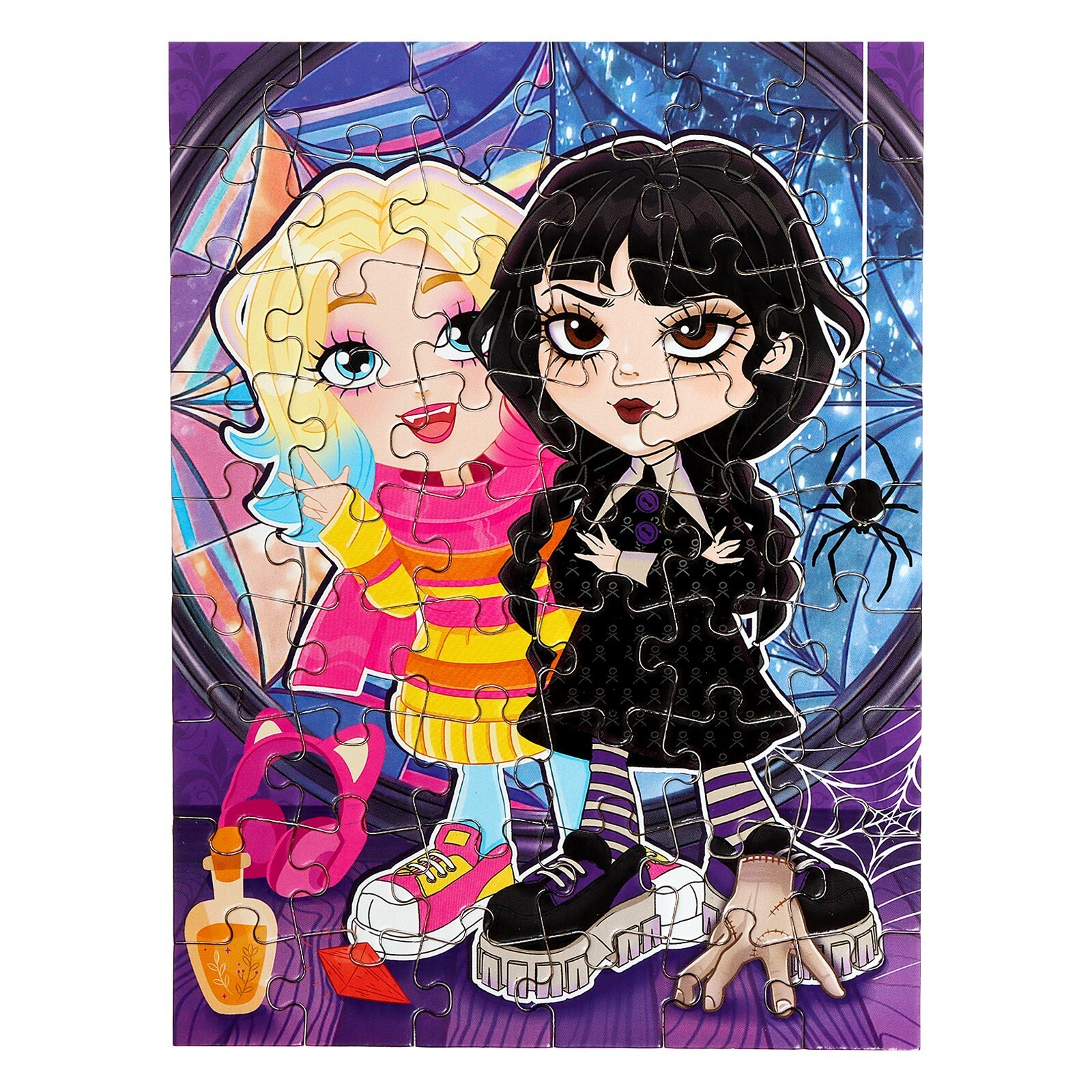 Данный пазл содержит пятьдесят четыре детали из картона. Соедините все элементы вместе и получите красочное карикатурное изображение двух героинь из известного сериала о юной представительнице необычной семьи.