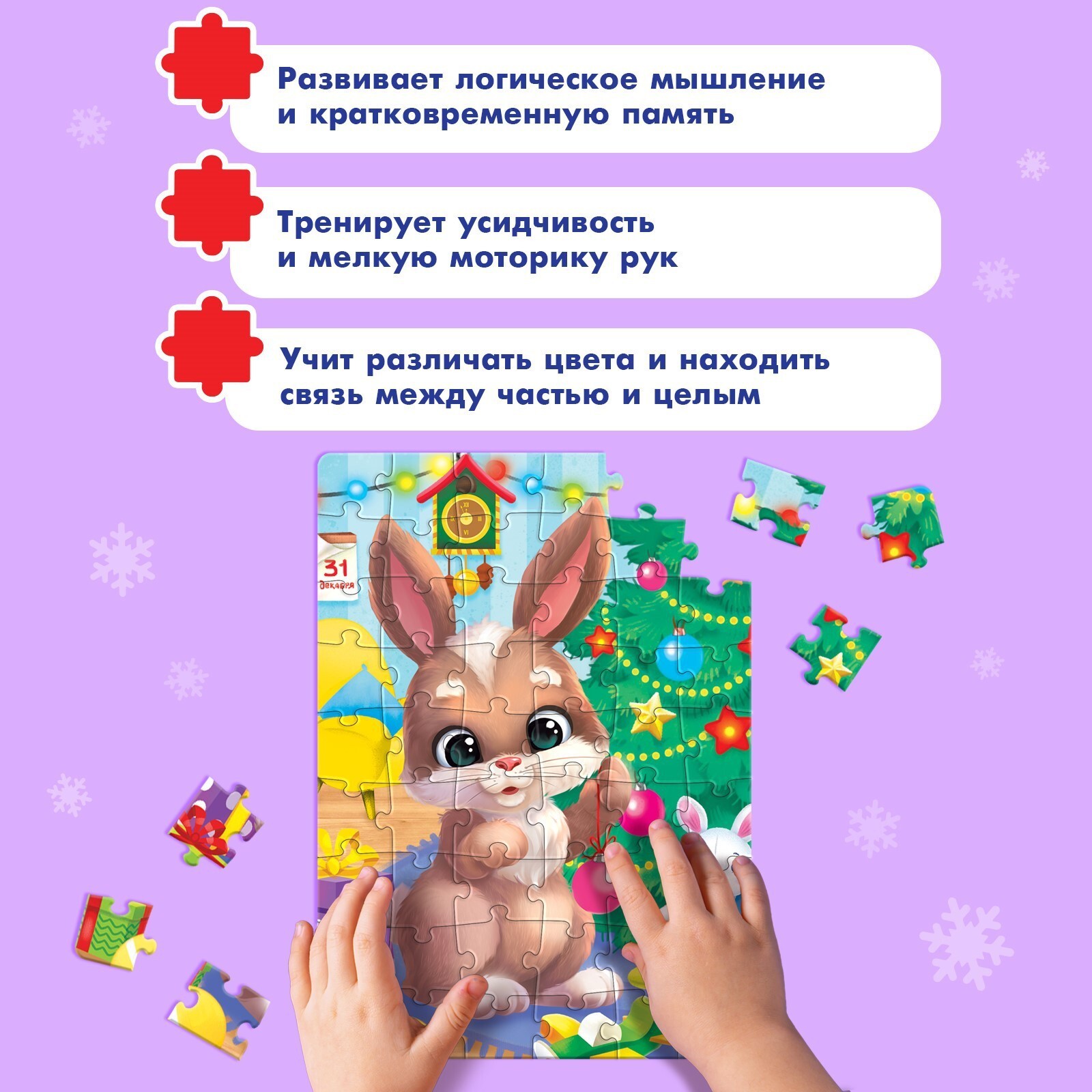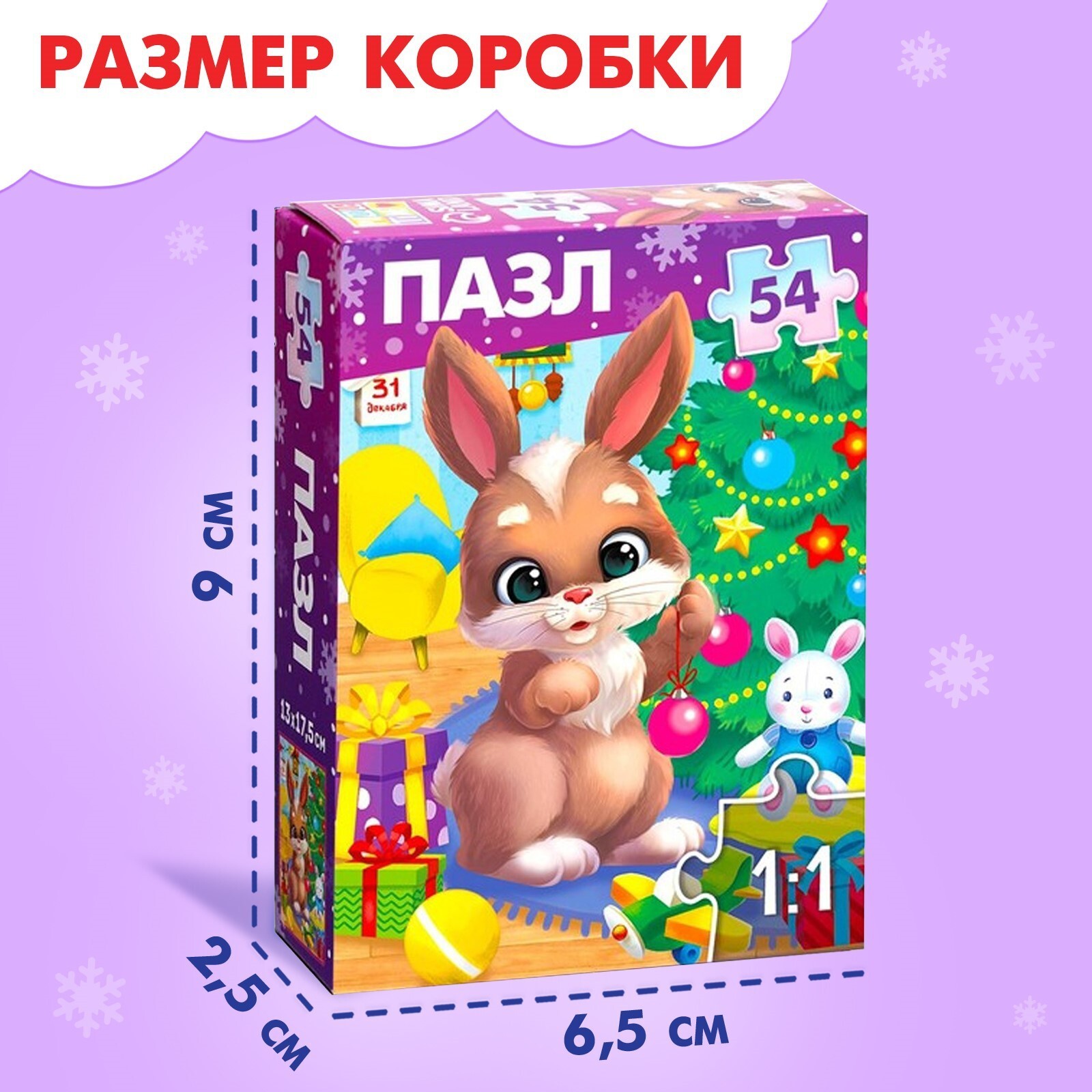 Данный детский пазл содержит пятьдесят четыре ярких детали. Соберите все элементы вместе и получите красочную иллюстрацию в новогодней тематике с кроликом, подарками, и елочными игрушками!