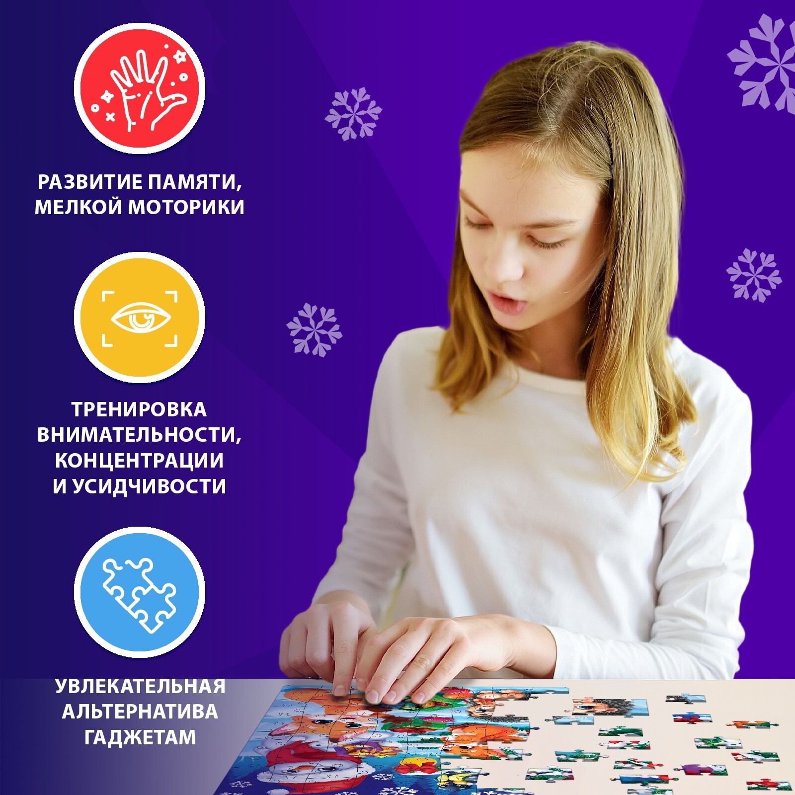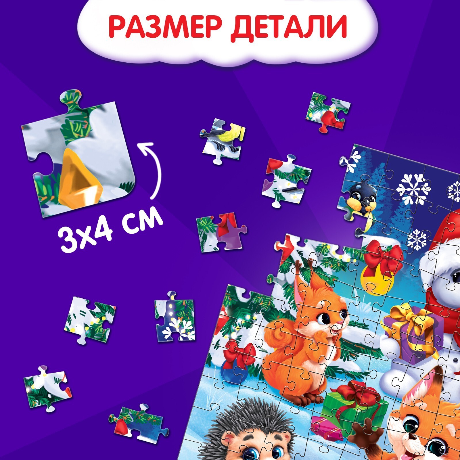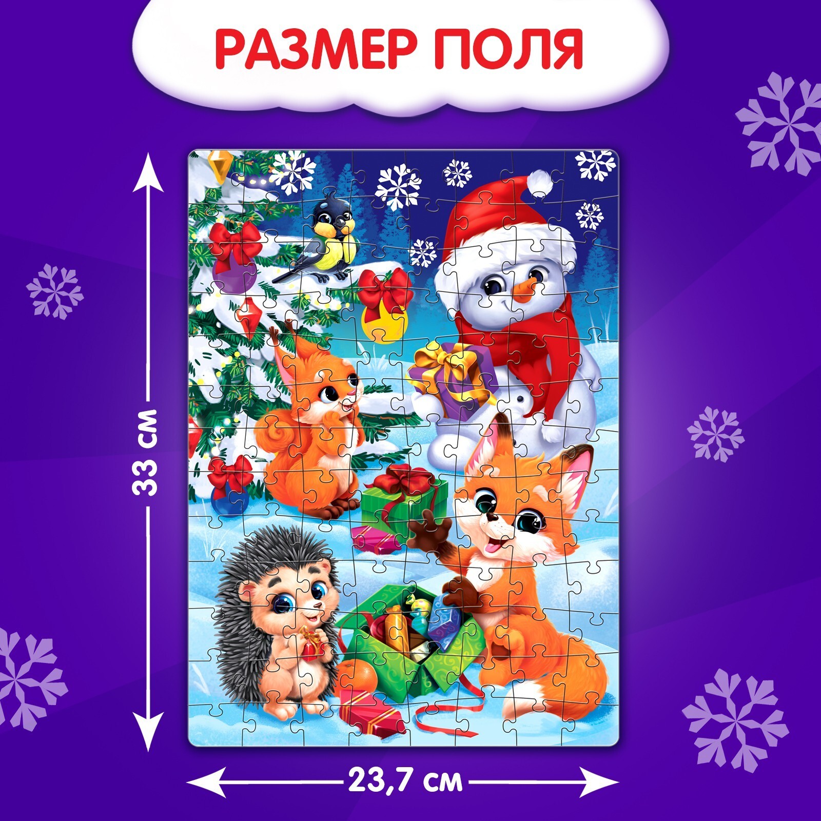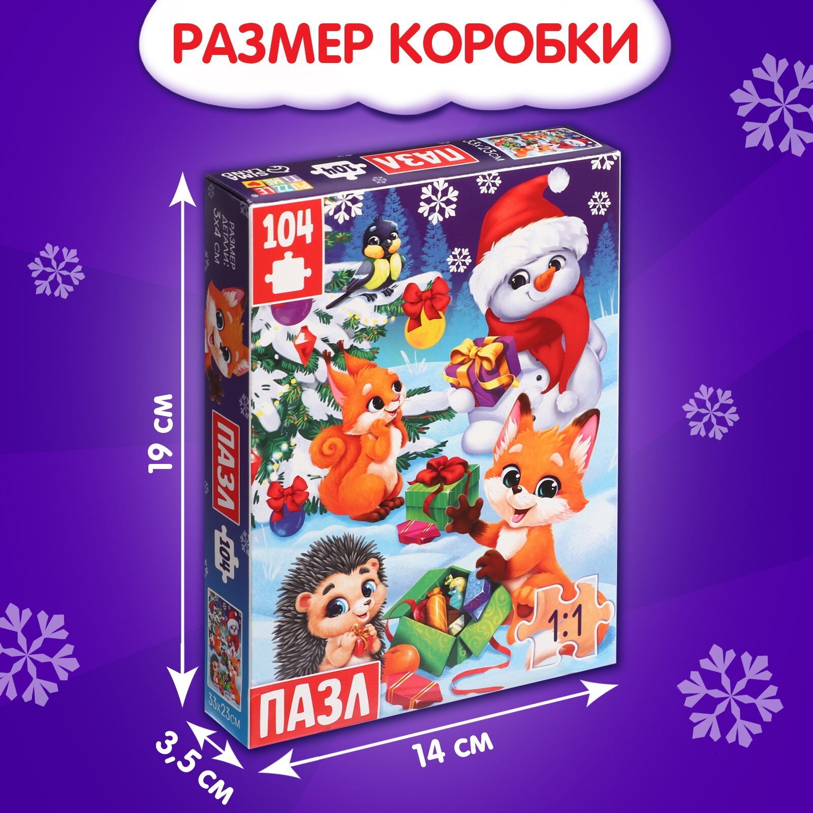 Данный пазл изготовлен из плотного картона и содержит сто четыре детали. Соединив все элементы вместе, вы получите красочное изображение с милыми лесными зверятами, готовыми отмечать новогодние праздники!