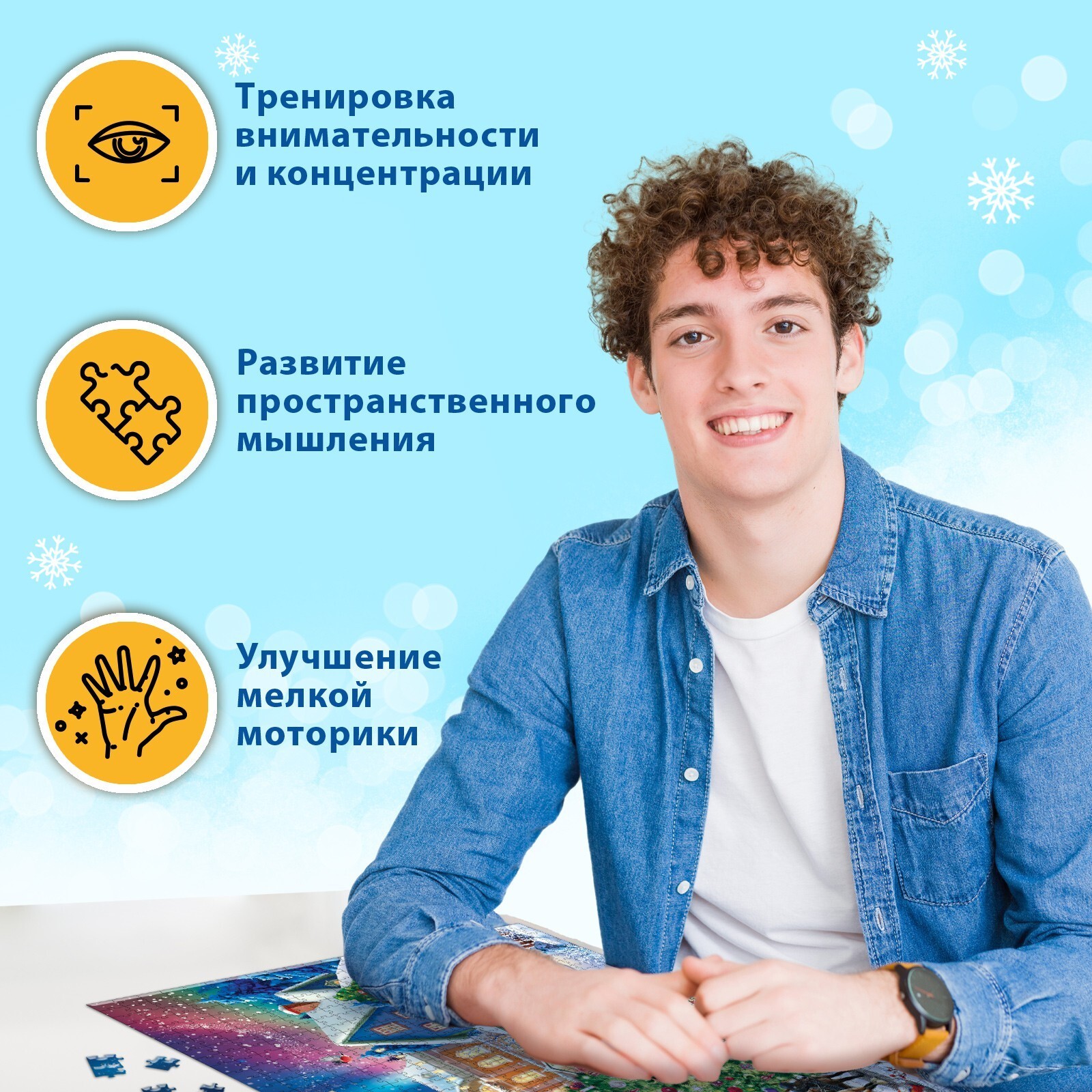 Соберите красочное новогоднее изображение! Данный пазл содержит тысячу деталей размера 18x18мм из картона. В собранном виде вы получите большую яркую иллюстрацию, полную сказочной и теплой атмосферы праздника.