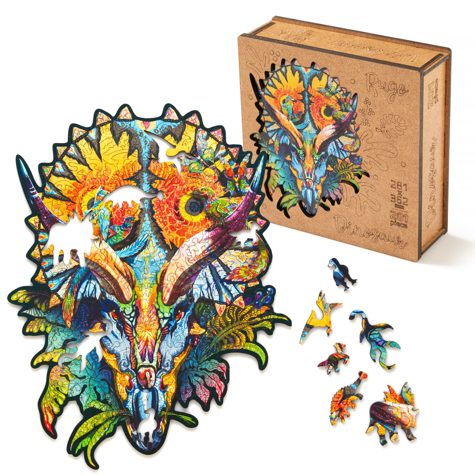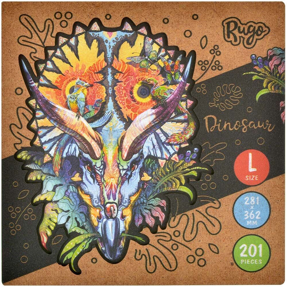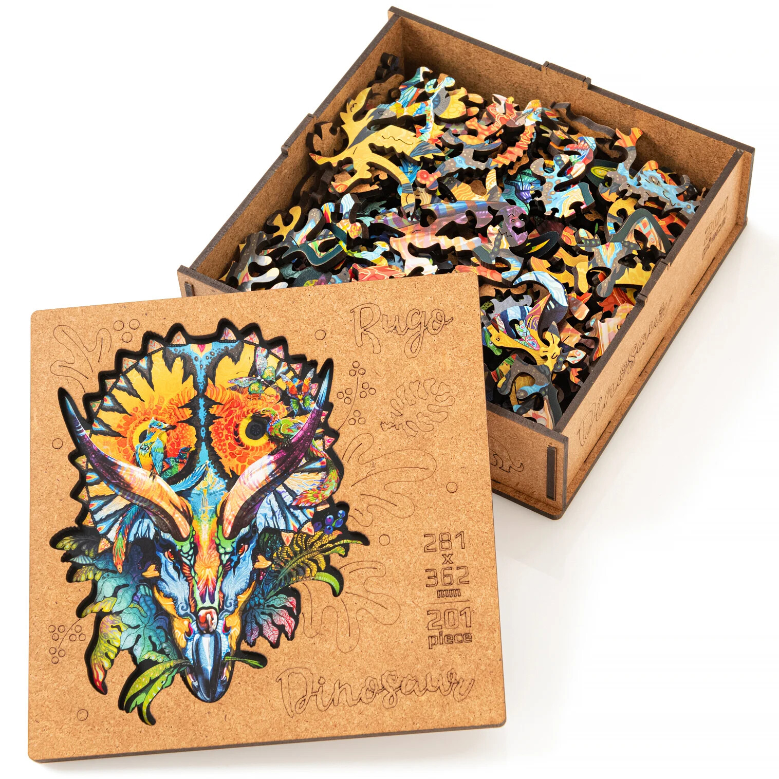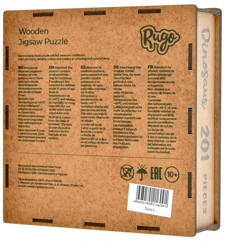 Перед вами довольной необычный пазл - его элементы изготовлены не из картона, а из дерева. Прочные детали разной формы с высоким качеством печати собираются в красочную разноцветную иллюстрацию с динозавром. Размер собранного пазла составит 281x362мм.