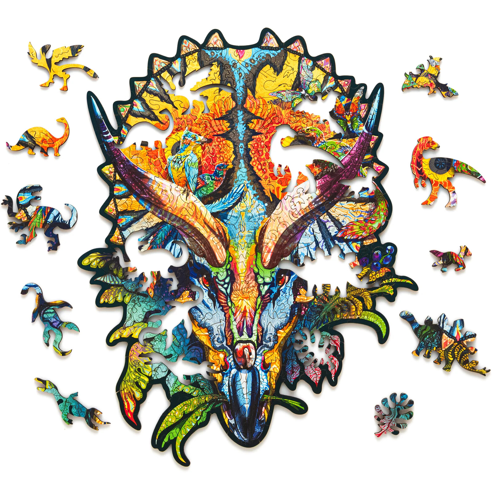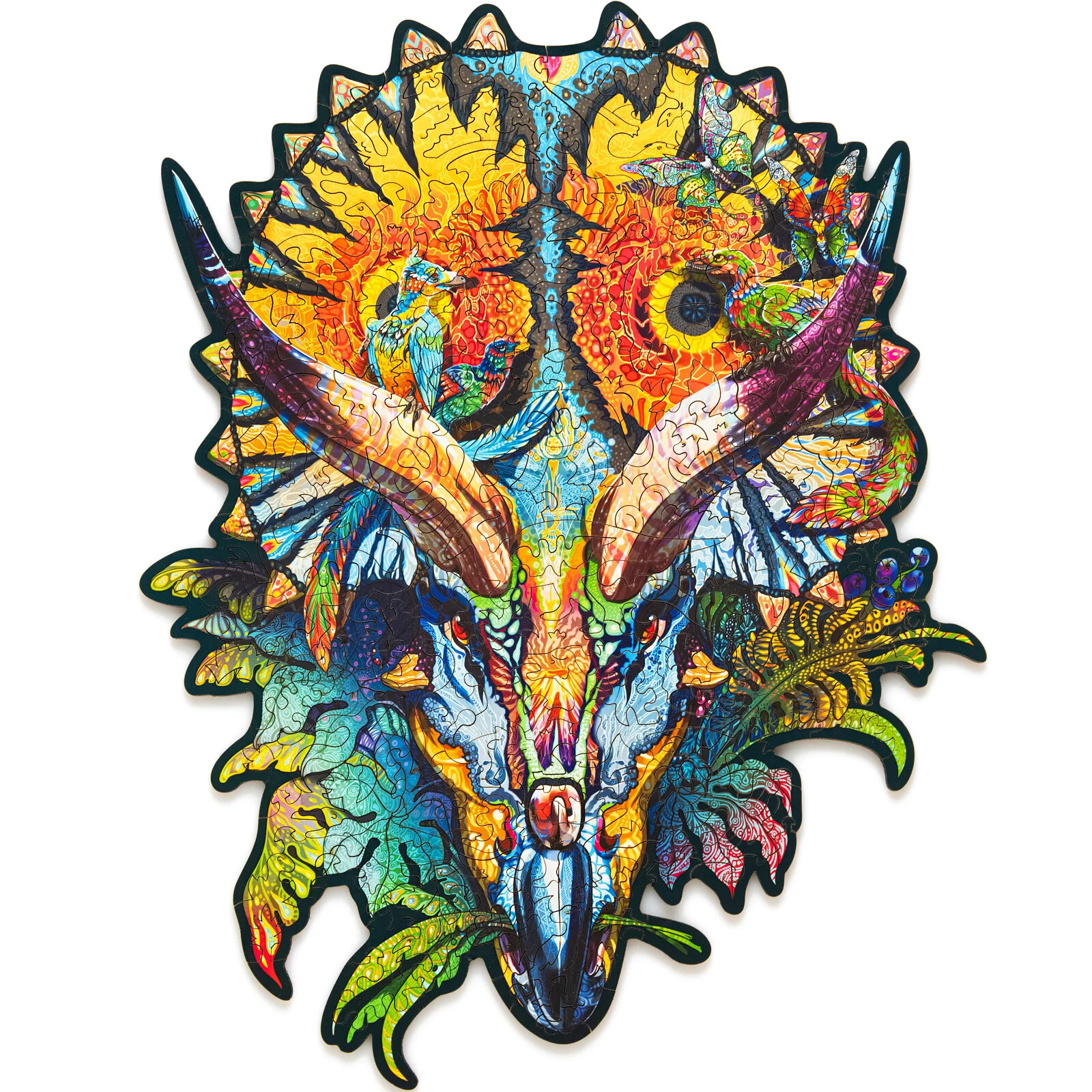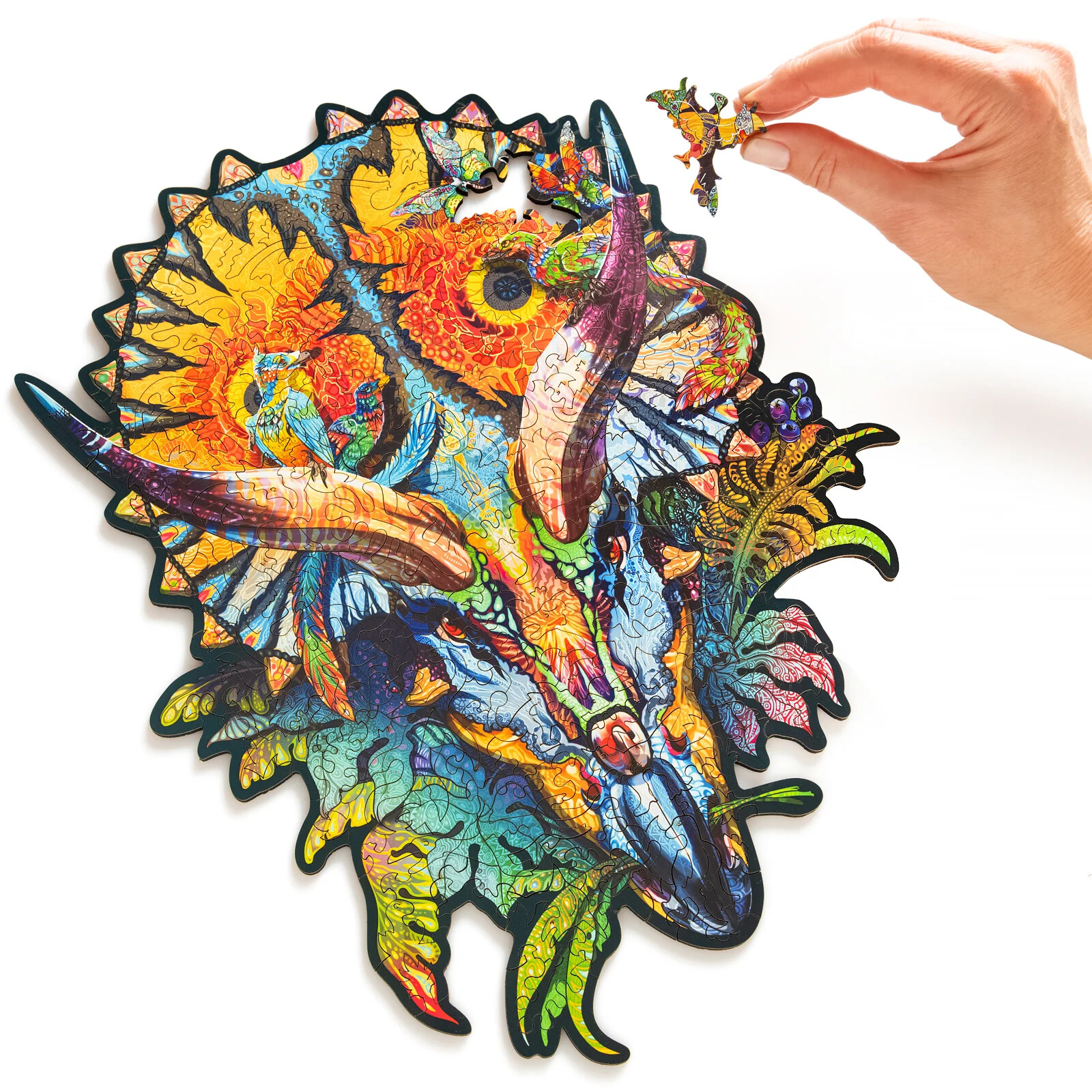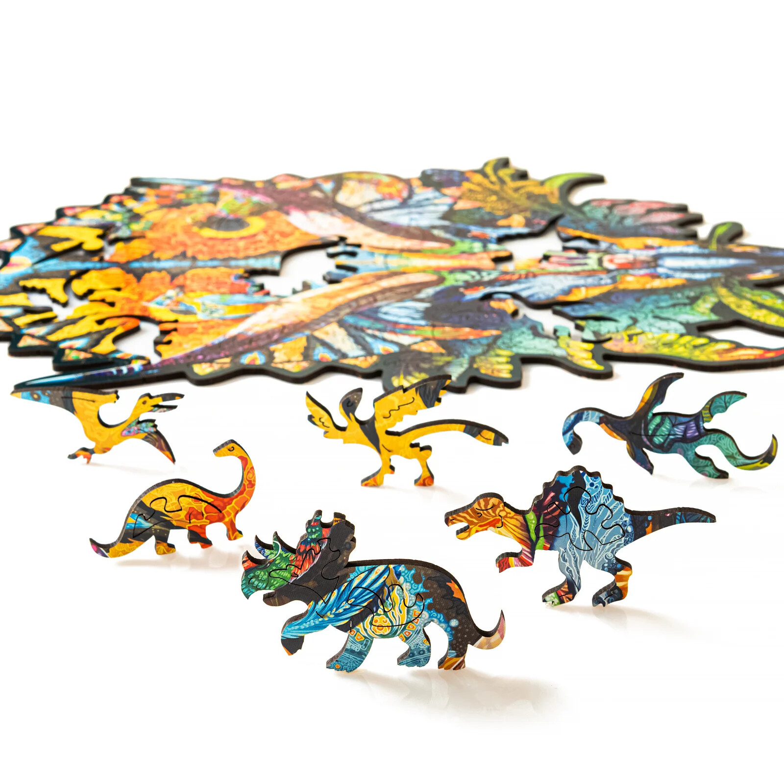 Перед вами довольной необычный пазл - его элементы изготовлены не из картона, а из дерева. Прочные детали разной формы с высоким качеством печати собираются в красочную разноцветную иллюстрацию с динозавром. Размер собранного пазла составит 281x362мм.