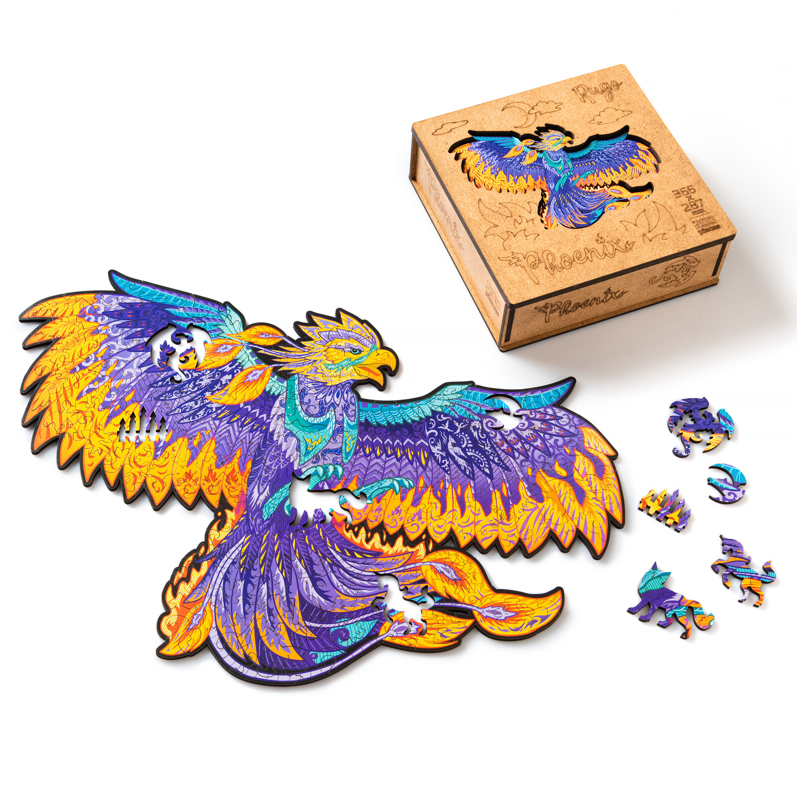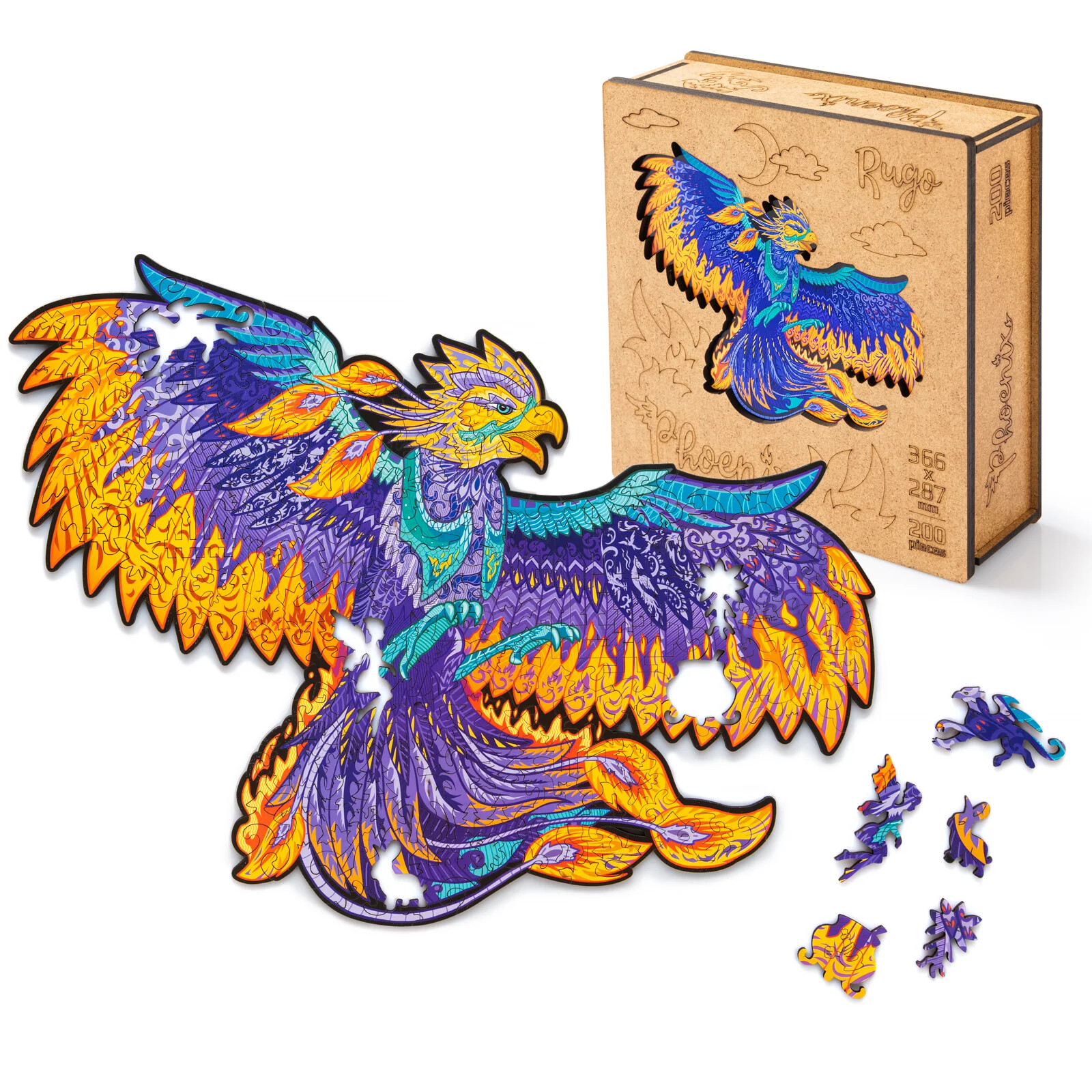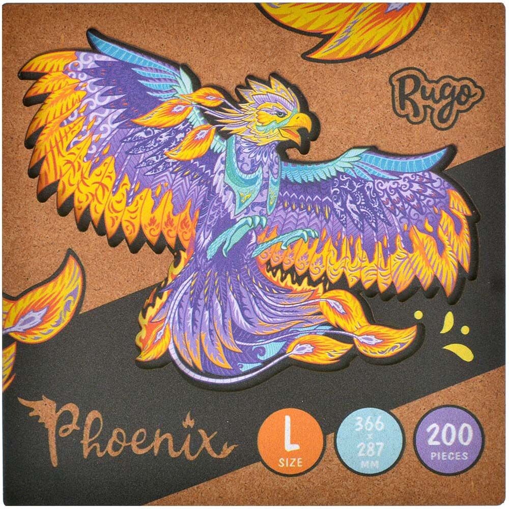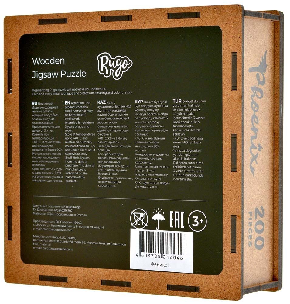 Деревянный пазл отличается высоким качеством деталей и рисунка. Двести элементов пазла соединяются в разноцветную иллюстрацию с фениксом, расправляющим крылья. В собранном виде размер пазла составит 366х287мм.