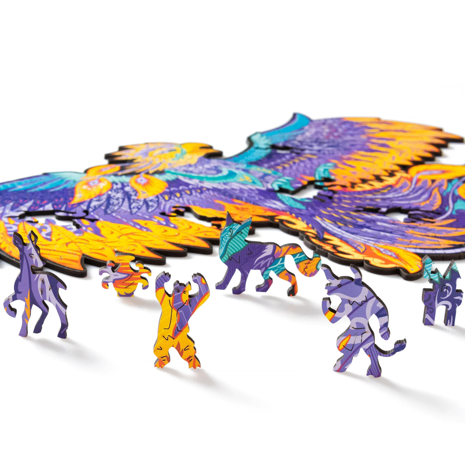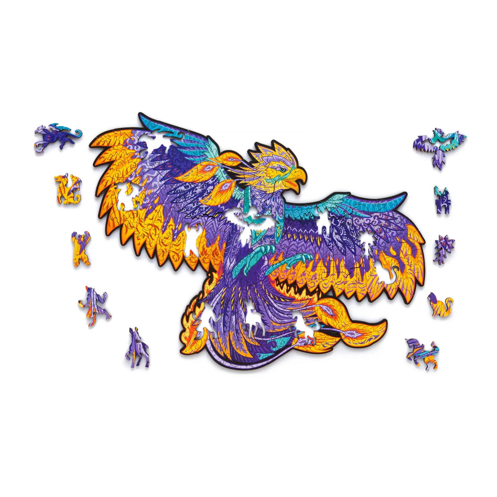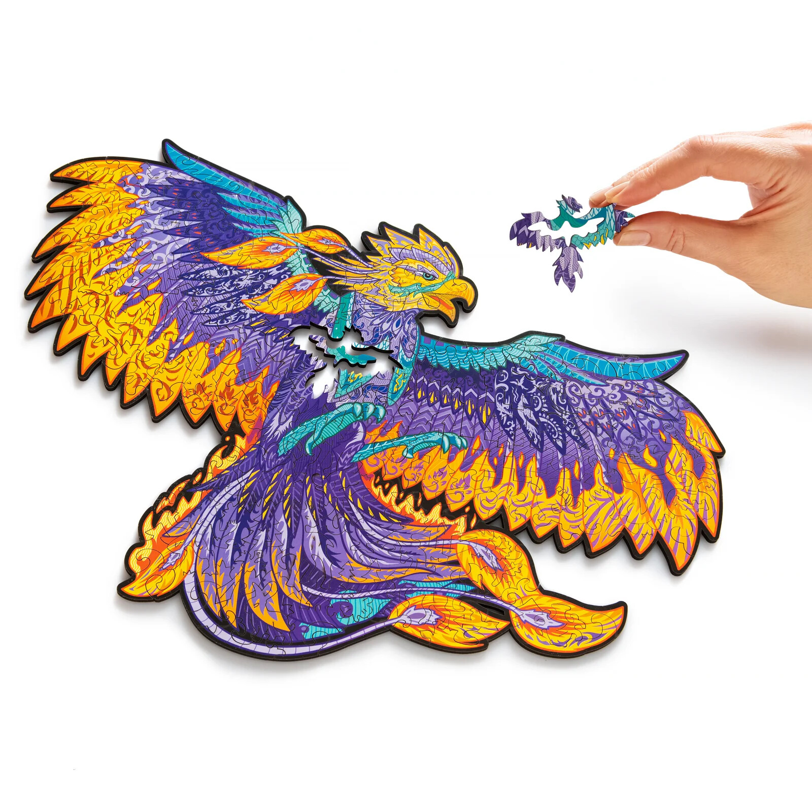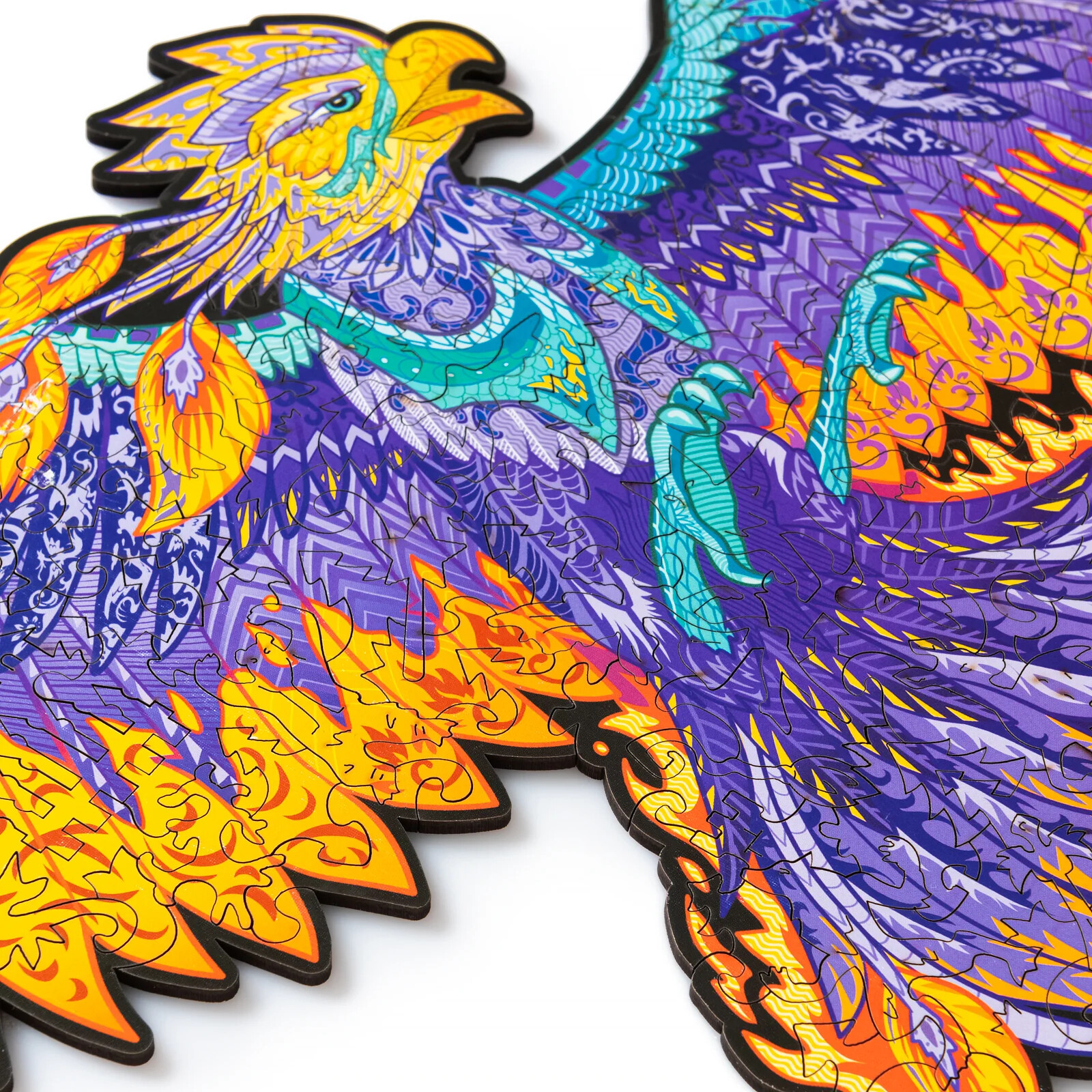 Деревянный пазл отличается высоким качеством деталей и рисунка. Двести элементов пазла соединяются в разноцветную иллюстрацию с фениксом, расправляющим крылья. В собранном виде размер пазла составит 366х287мм.
