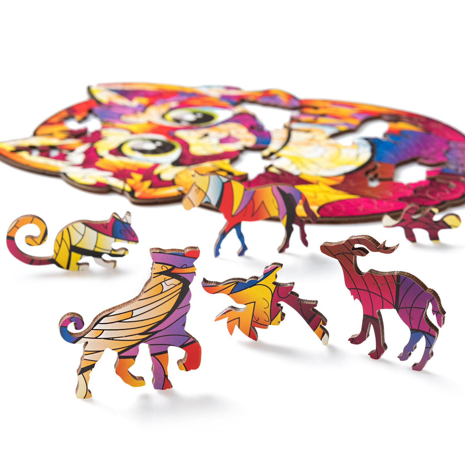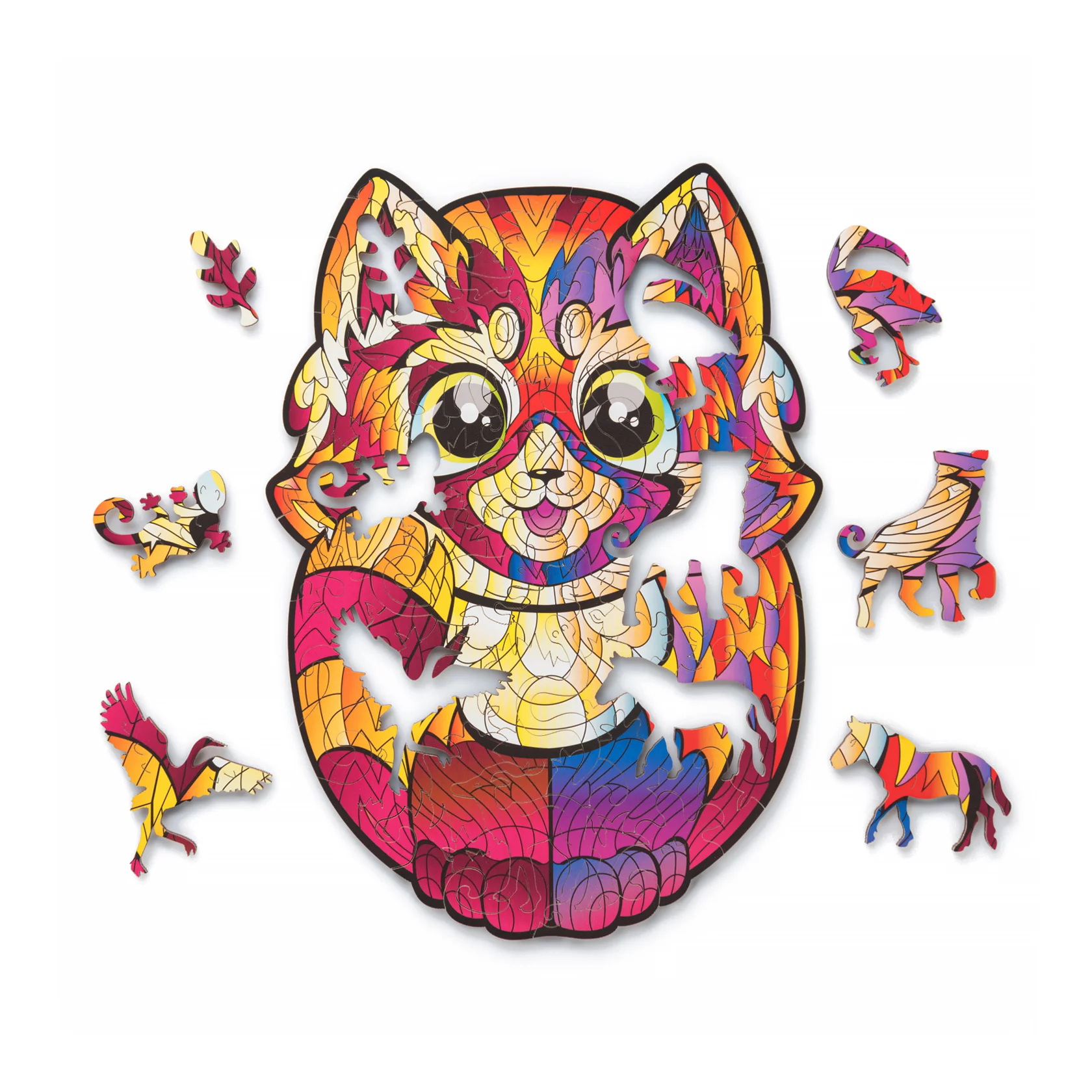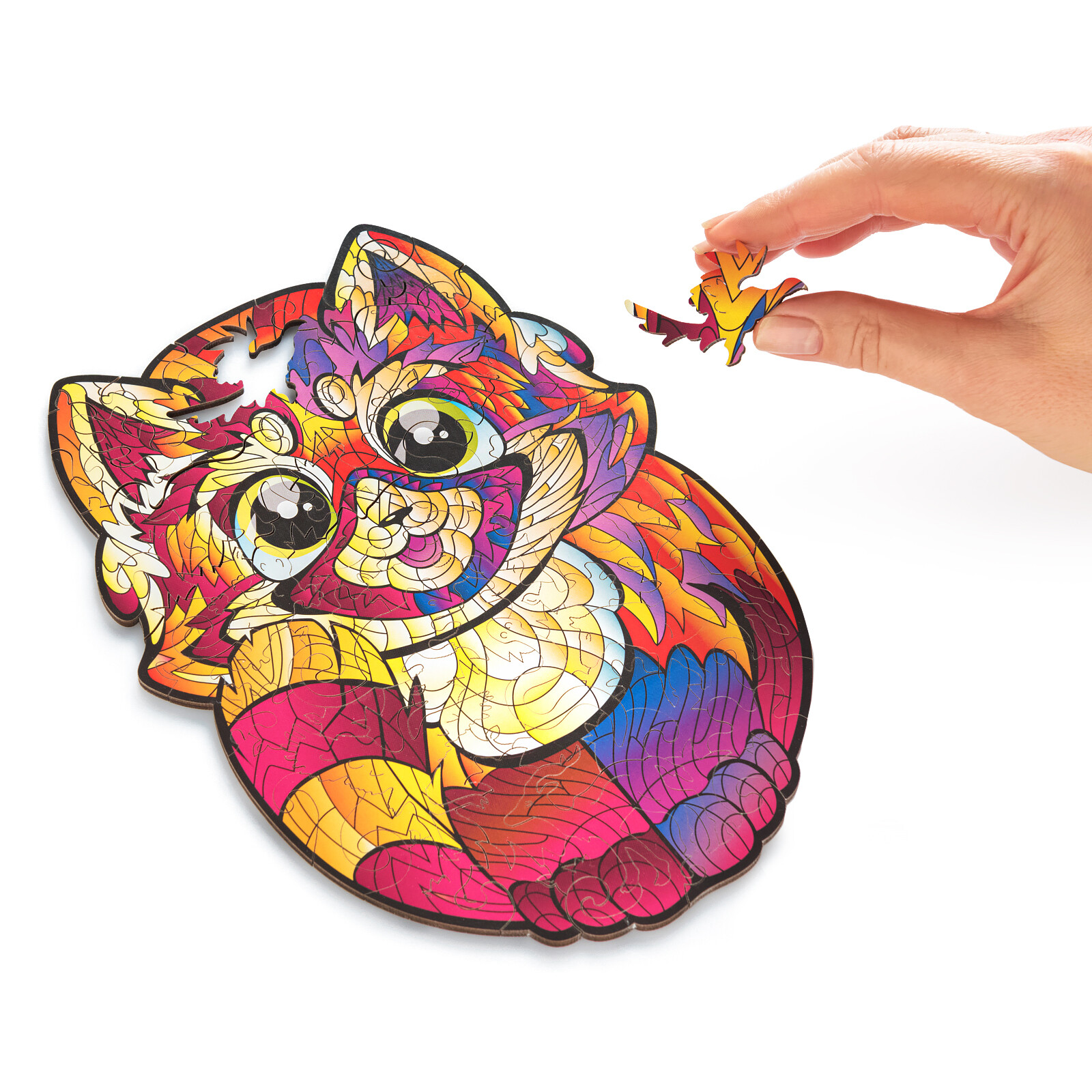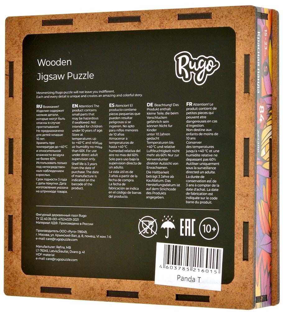 Особенность данного пазла заключается в том, что его детали изготовлены из дерева. Восемьдесят четыре элемента различных форм собираются в одну яркую картину с изображением маленькой панды.