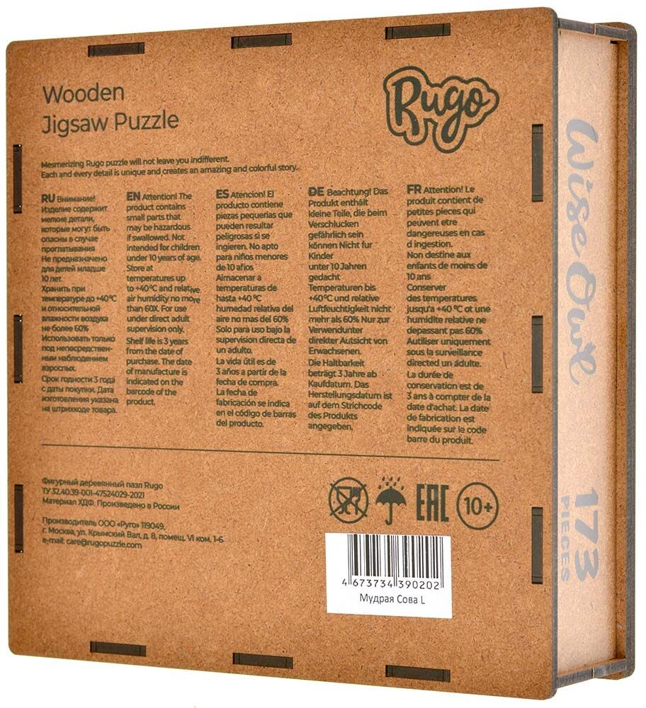 Деревянный пазл имеет множество элементов разной формы и размера, идеально стыкующихся друг с другом при сборке. Сто семьдесят три детали собираются в яркую иллюстрацию летящей совы.