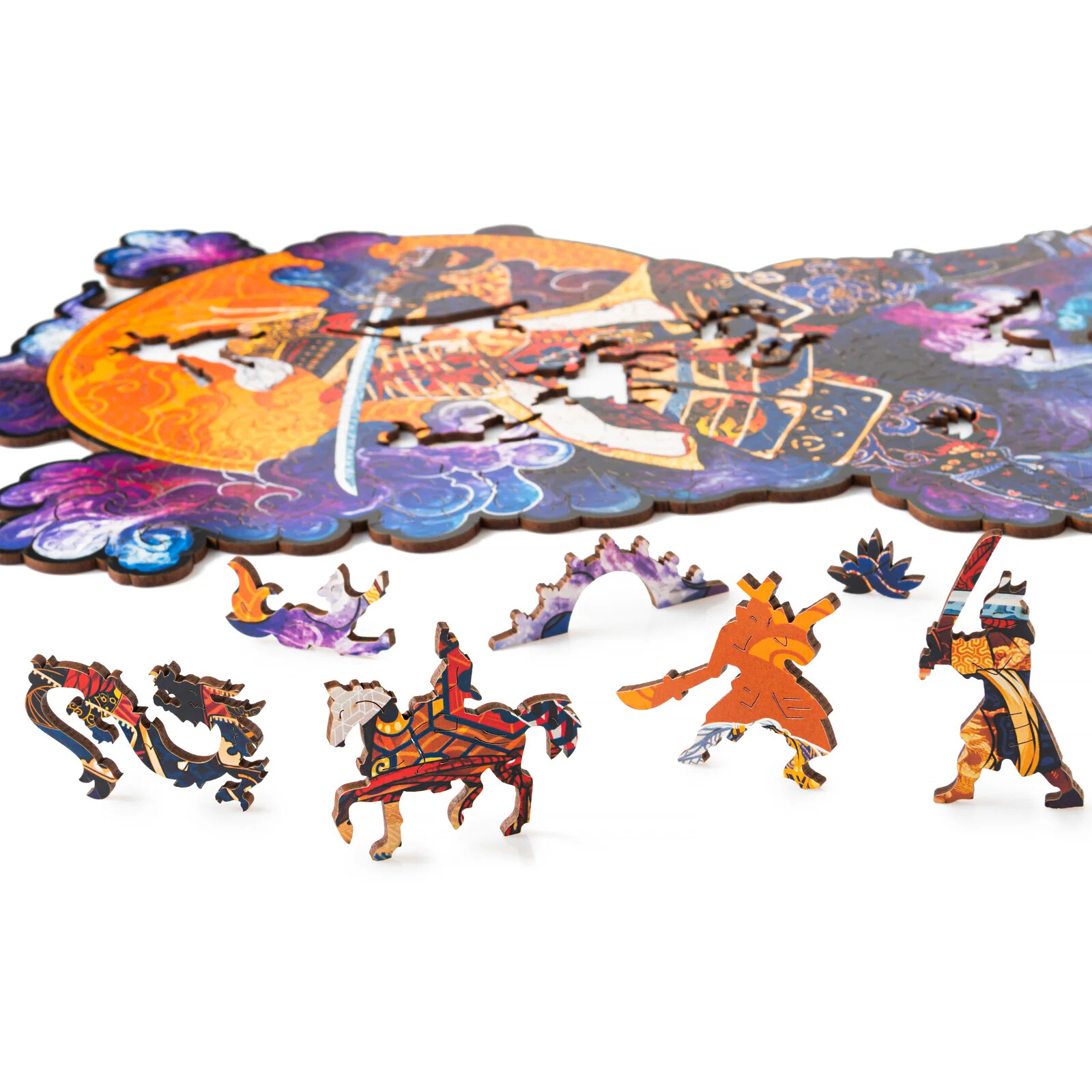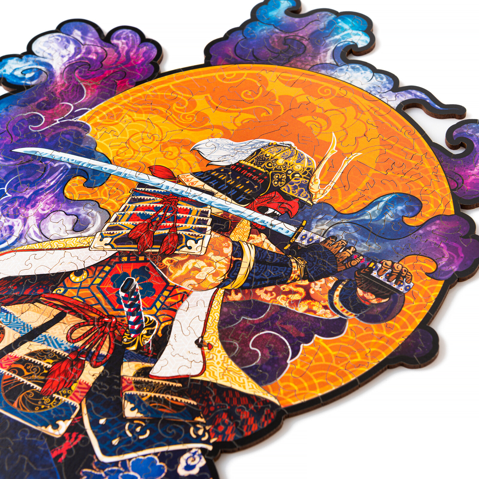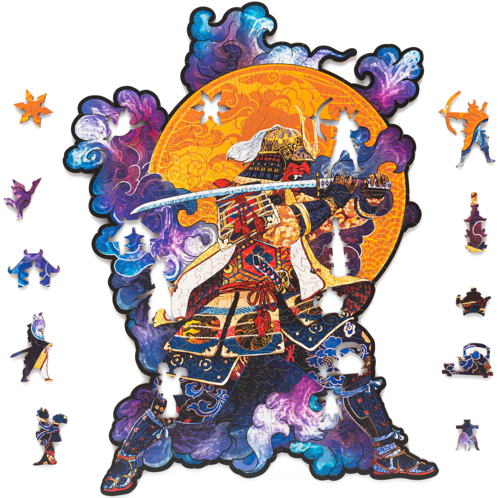 Данный пазл содержит множество деталей, и собрать его будет непростой задачей. Множество деревянных элементов по итогу соединятся в красочную и большую иллюстрацию с самураем, готовым к бою. В собранном виде размер пазла составит 420x558мм.
