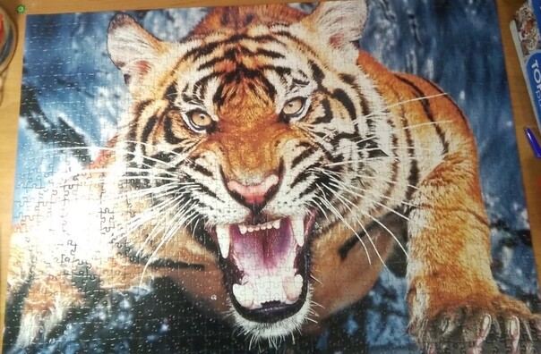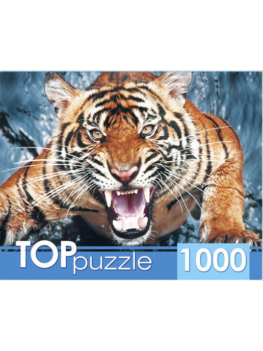 Скрасьте время за сбором пазла! В коробке вы найдете тысячу деталей из картона. С помощью них вы сможете собрать большую иллюстрацию с хищным тигром, готовым к атаке.