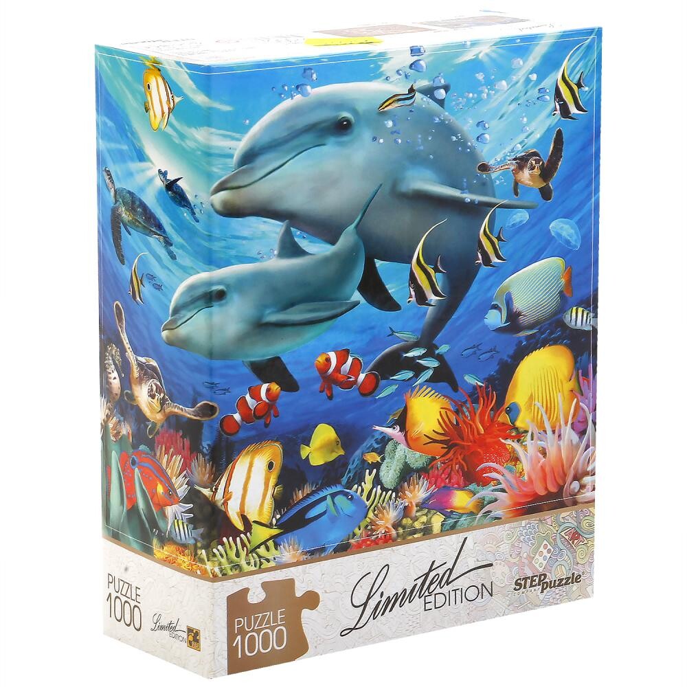 Проведите время за сбором пазла! В коробке вы найдете тысячу картонных деталей. С помощью них вы сможете собрать красочную и большую иллюстрацию множества представителей подводного мира.