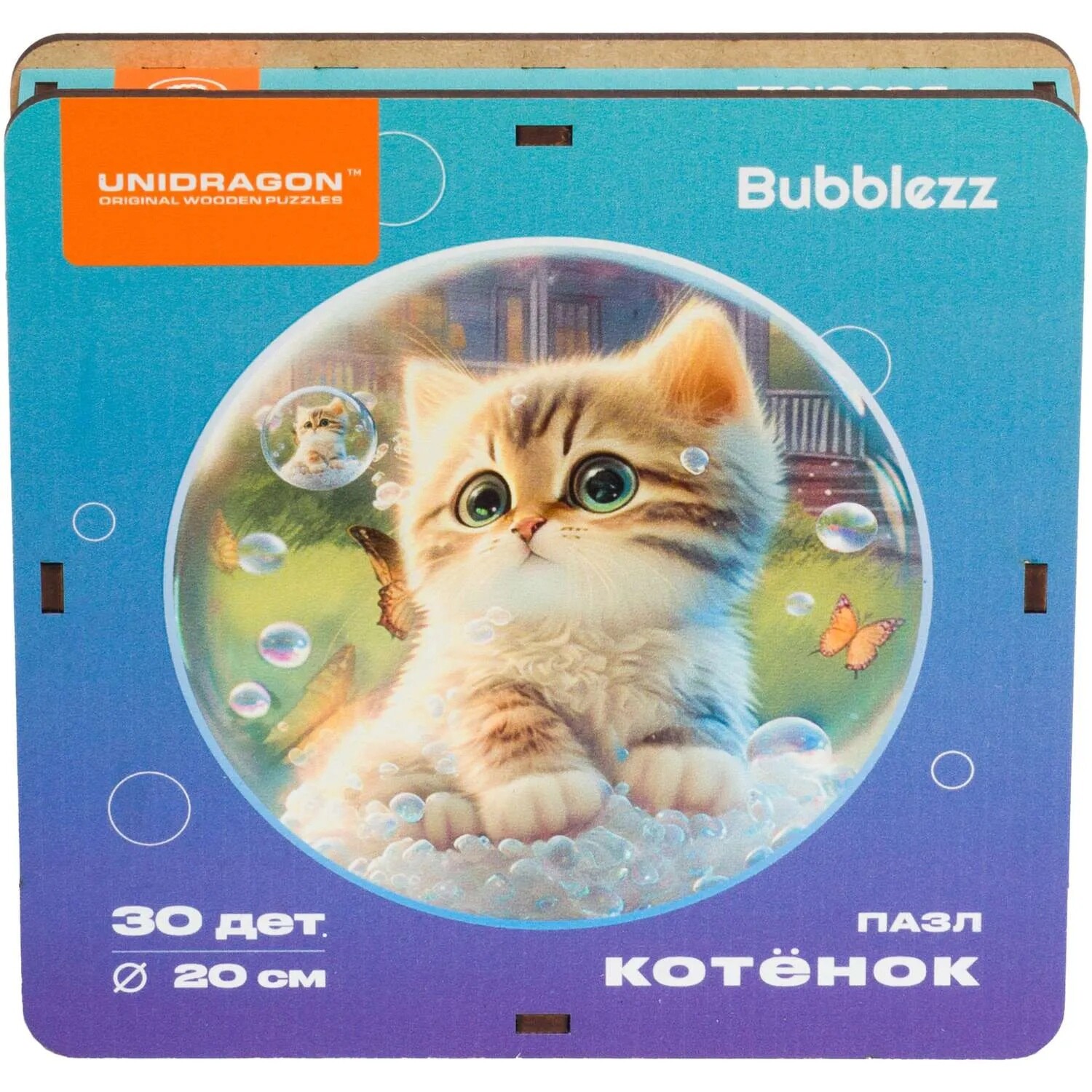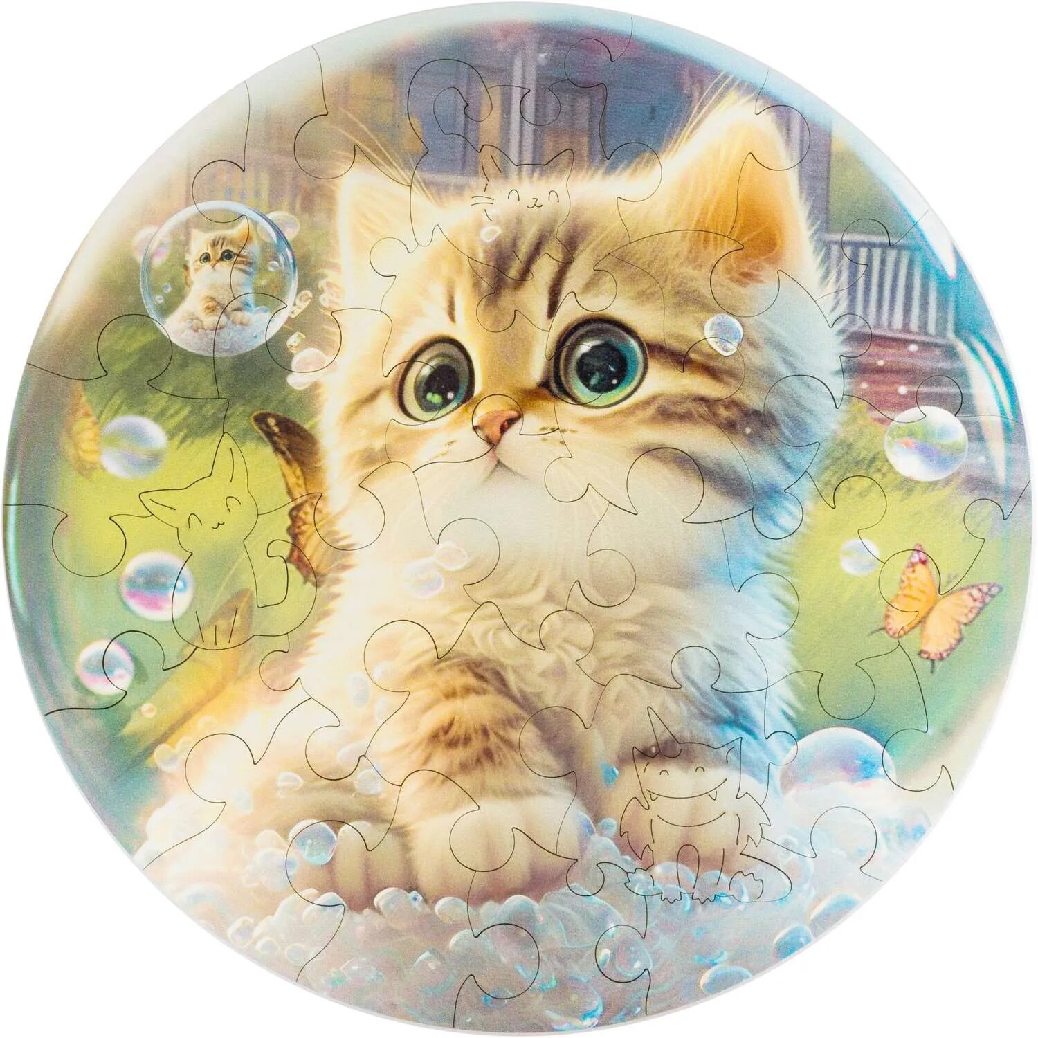 Данный пазл изготовлен из дерева и имеет тридцать деталей разной формы. Собрав все детали вместе, вы получите волшебную и красочную иллюстрацию милого котенка. Размер собранного пазла составит 250x250мм.