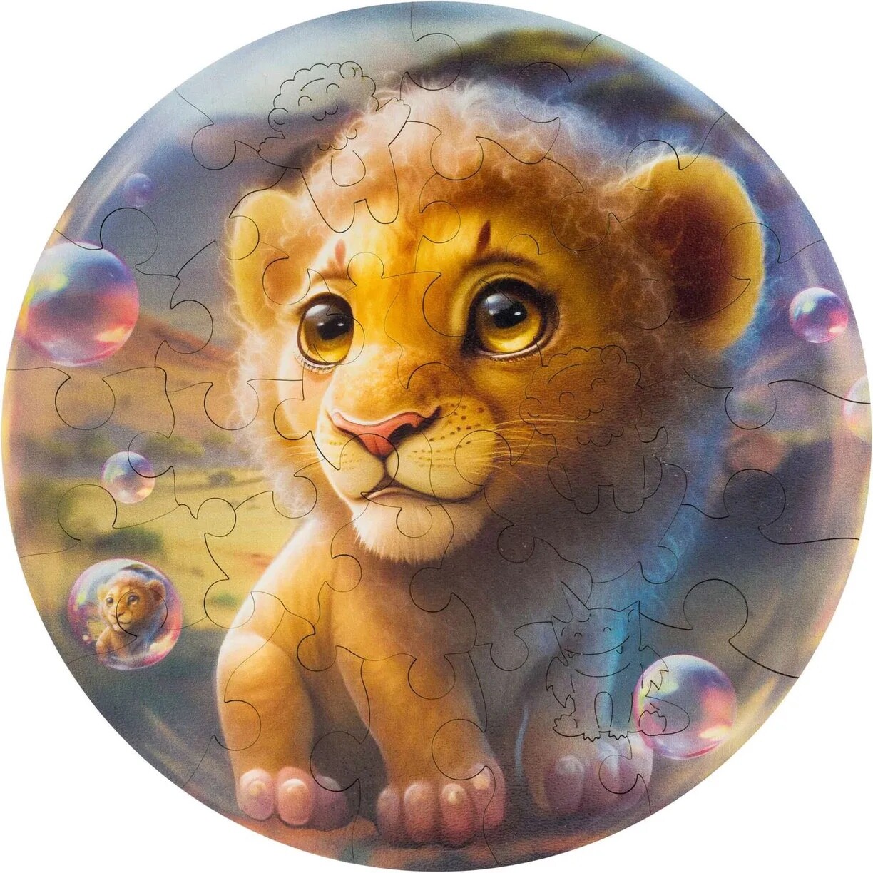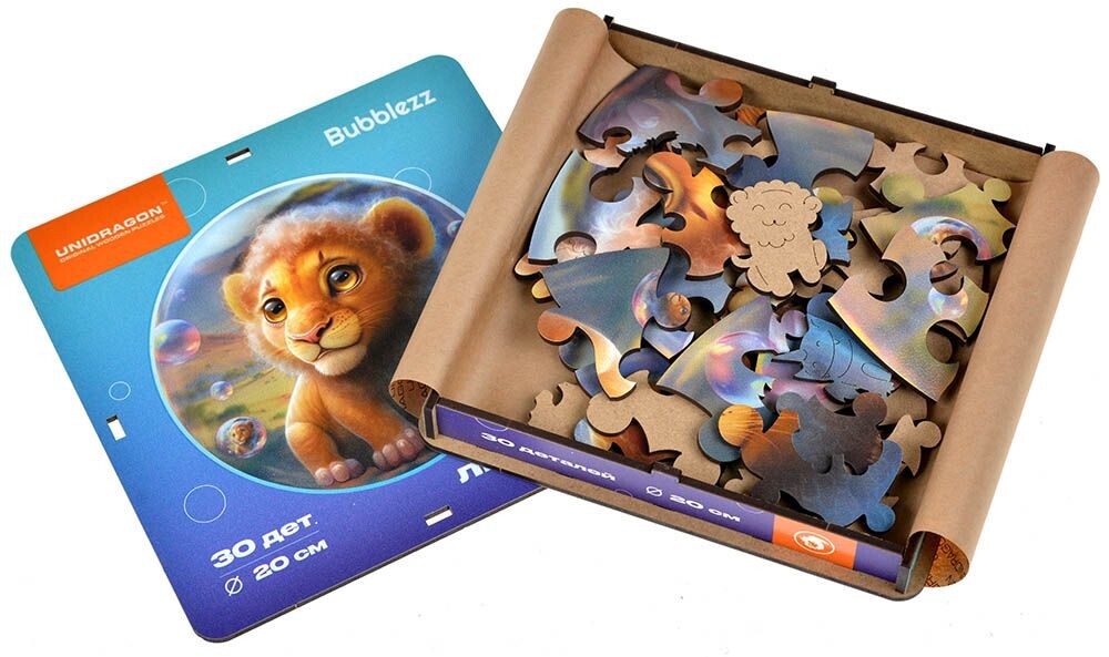 Компактный пазл изготовлен из дерева высокой прочности. Собрав все детали вместе, вы получите волшебной красоты иллюстрацию с милым львенком. В коробке вас ждут тридцать элементов разной формы. Готовы создать из них красочное изображение?