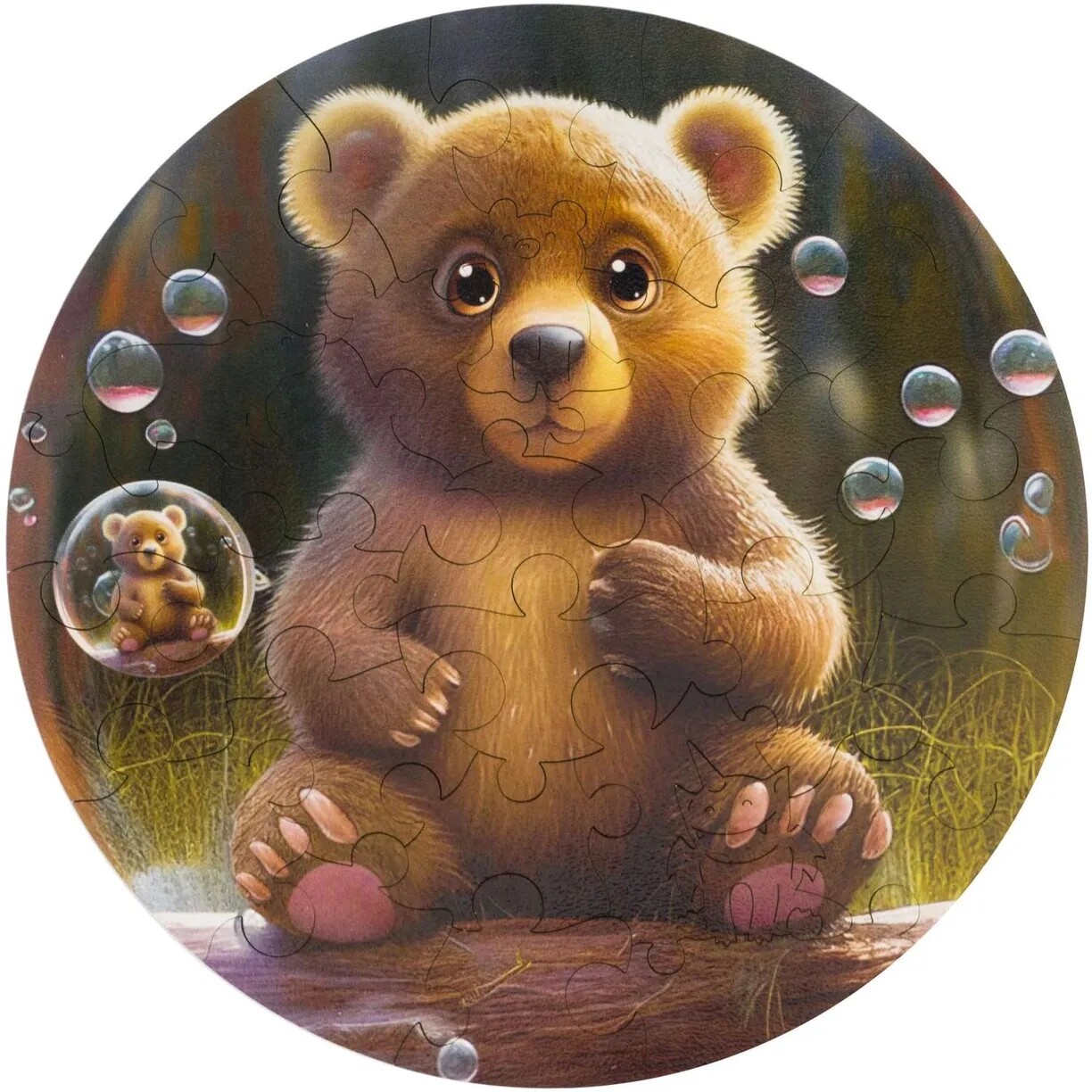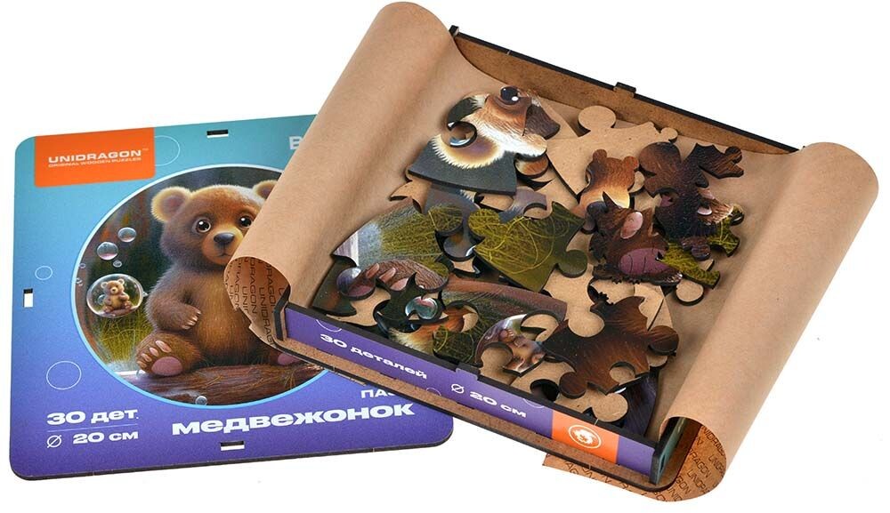 Пазл с деревянными элементами станет хорошей зарядкой для ума и поможет развить мелкую моторику. Тридцать деталей, изготовленных из дерева, собираются в красочную и милую иллюстрацию с маленьким медвежонком. В собранном виде размер пазла составит 250x250мм.