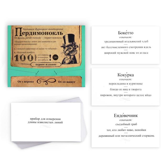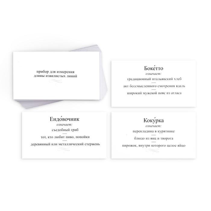 В небольшой коробке вы найдете карточки с разными необычными и странными словами, которые практически не встречаются в современной речи. Под словом есть три варианта того, что оно на самом деле означает. Задача игроков - угадать правильное значение. Кто сможет это сделать, получит карту себе. Победит самый эрудированный игрок!