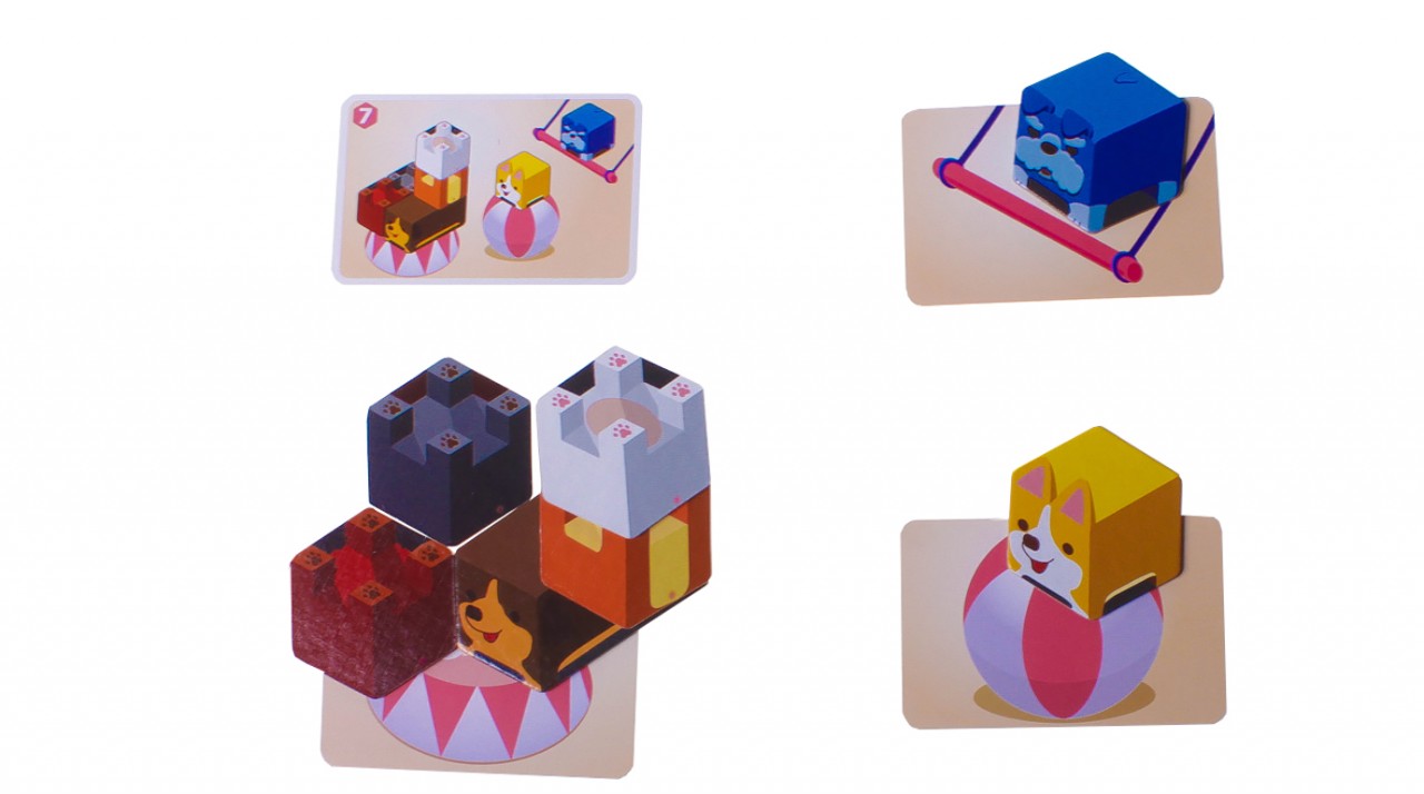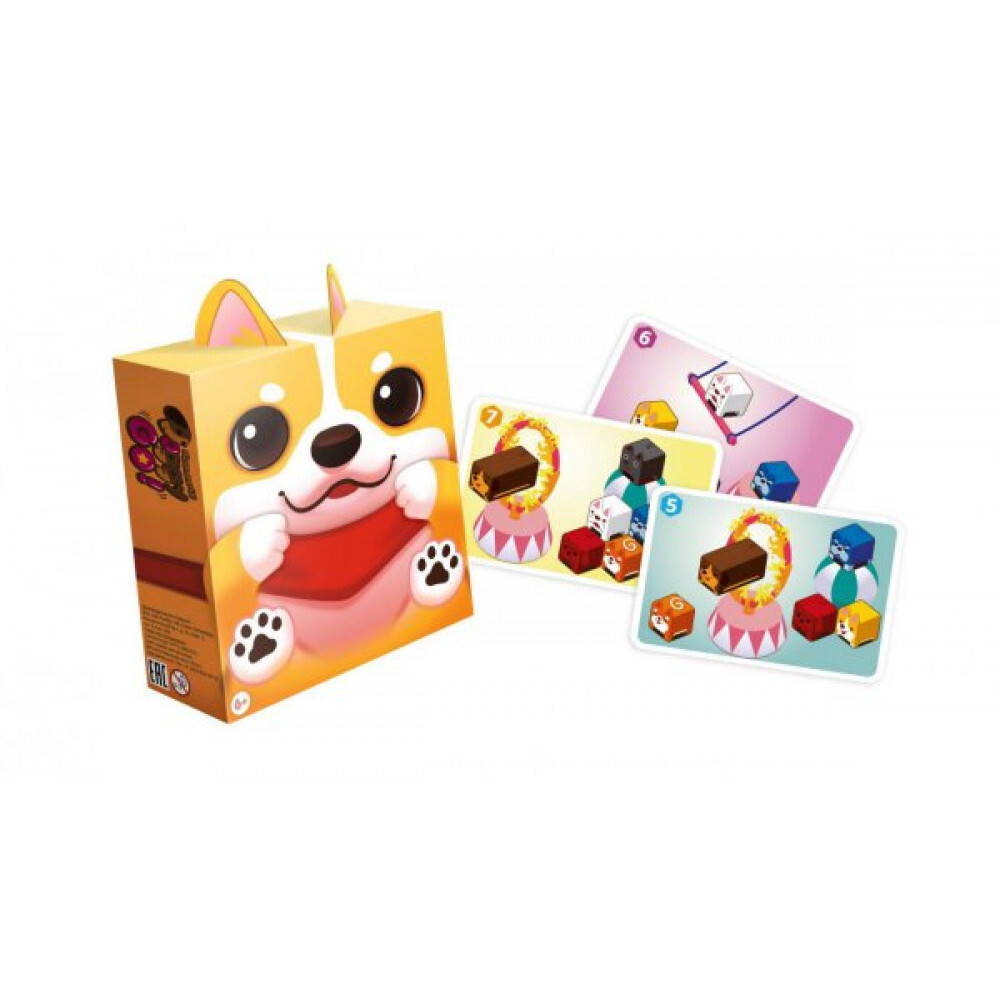 Песики-акробаты в городе! Они готовы представить уникальное представление на радость публике! Поможете им в этом? В данной настольной игре участникам предстоит с помощью кубических собачек различных пород выполнять акробатические этюды, получая за это победные очки. Открывая карты с изображением условий, игроки стараются сложить собачек так, как показано на картинках, причем соревнуясь между собой на скорость. Тот, кто первым это сделает, должен сказать громогласное "Гав!", тем самым остановив остальных. После чего начинается второй раунд. Игрок, который будет самым быстрым и внимательным, станет лучшим дрессировщиком и победит!