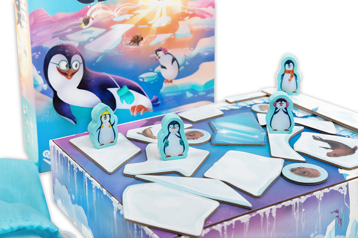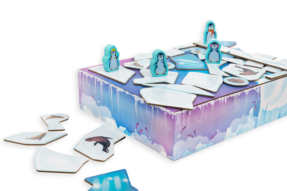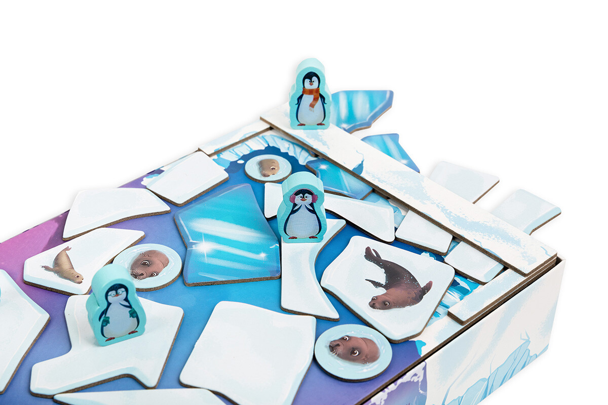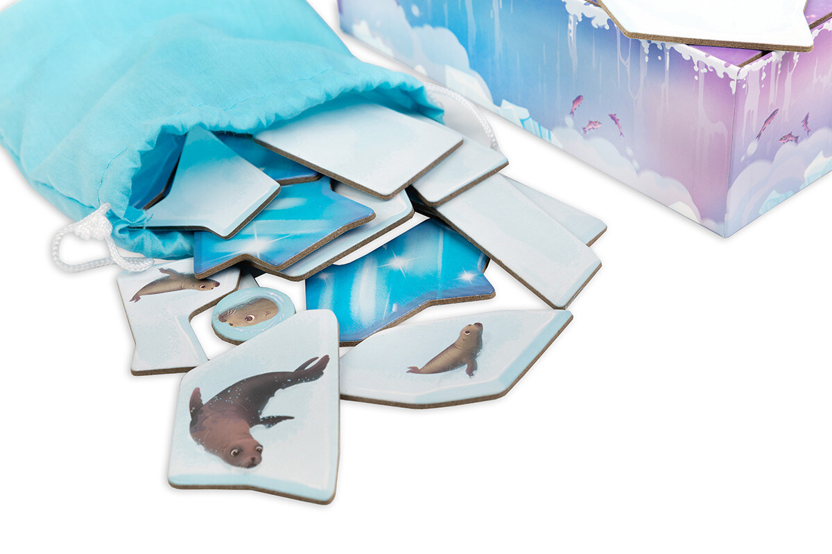 - игровое поле- 30 жетонов льдин- 12 жетонов морских львов- 4 деревянные фигурки пингвинов- тканевый мешочек- правила игры