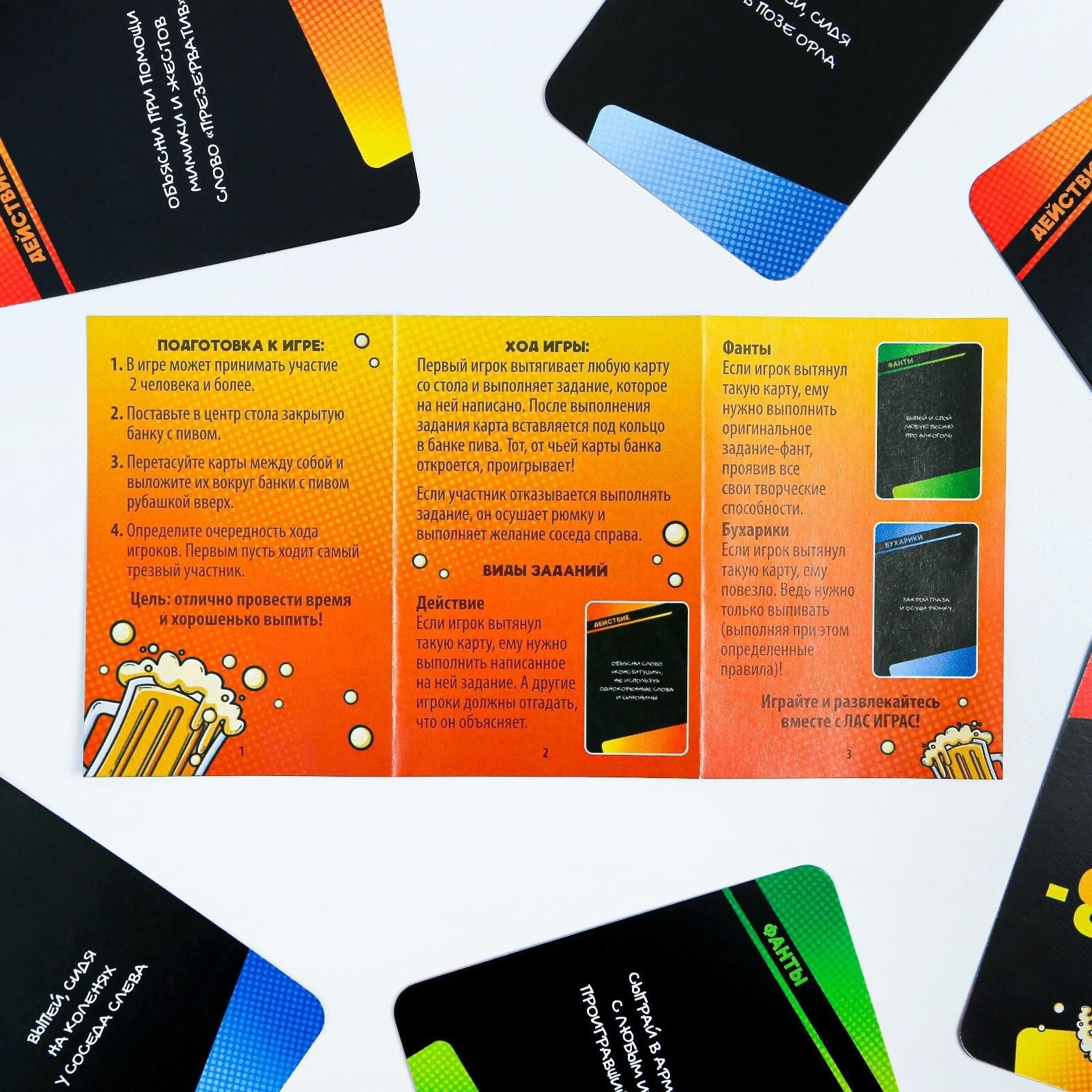 В данной карточной игре вас ждет множество заданий для застолья. Попробуйте выполнить фанты, пейте и веселитесь, а выполнив задачу, вставьте карту под кольцо пивной банки. Тот игрок, из-за которого банка таким образом откроется, станет проигравшим!